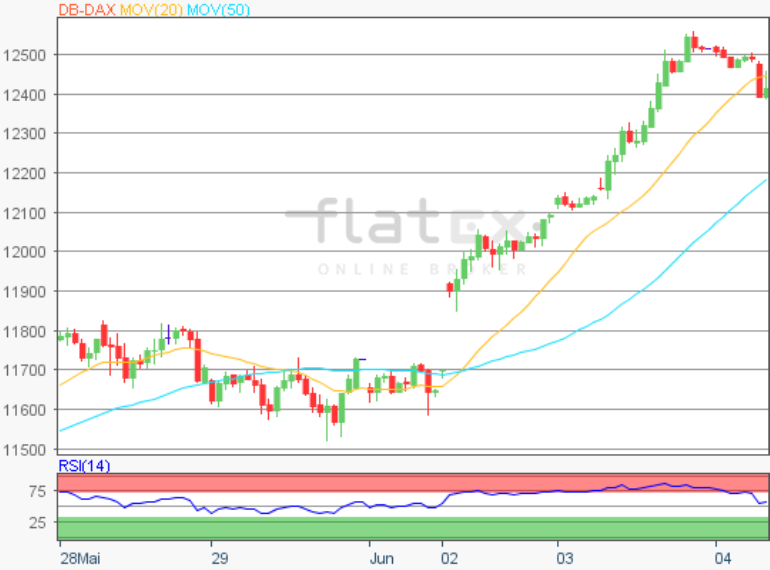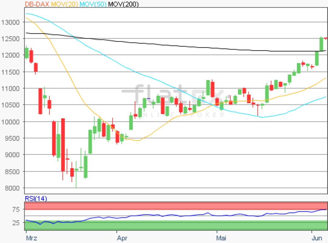 Die Hausse der letzten Wochen setzte sich auch am Mittwoch unvermindert fort. Wieder konnte der Deutsche Aktienindex stark zulegen. Zum Xetra-Handelsende notierte der DAX mit einem kräftigen Plus von 3,88 Prozent bei 12.487,36 Punkten.