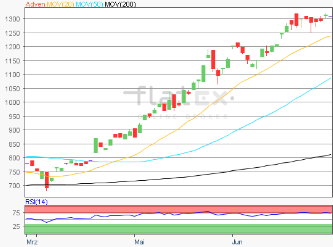 Die Aktie des niederländischen Zahlungsabwicklers Adyen notierte am 23. Juni 2020 auf einem letzten Zwischenhoch von 1.317,50 Euro.