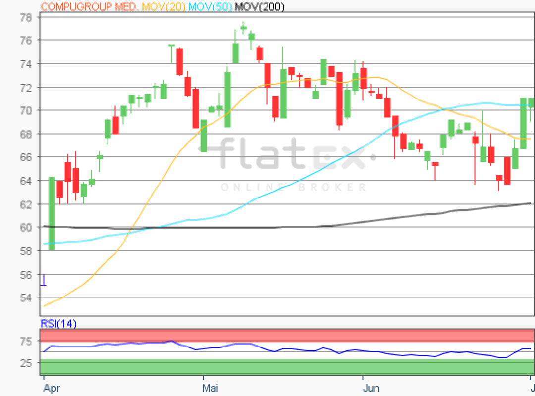 Die Aktie des MDAX-Konzerns CompuGroup notierte am 11. Mai 2020 auf einem letzten Zwischenhoch von 78,65 Euro.
