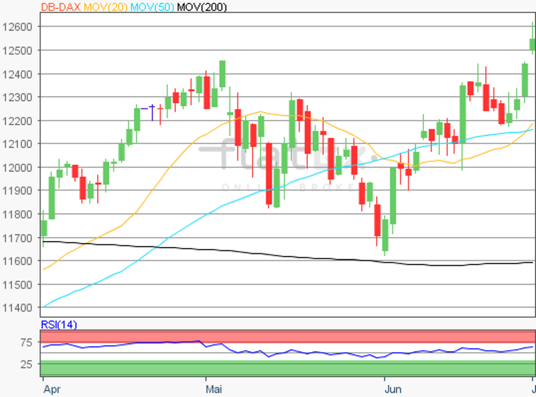 Der Deutsche Aktienindex profitierte zum Wochenbeginn von einem marktbreit vorhandenen „bullishen“ Impuls, der aufgrund der erleichternden Nachrichtenlage rund um das G20-Treffen im japanischen Osaka zustande kam.