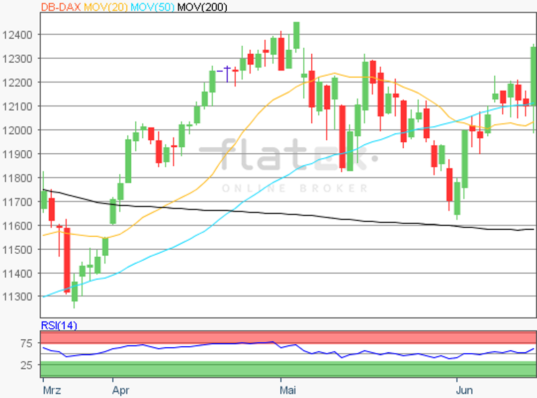 Der Deutsche Aktienindex kam am Dienstag nach anfänglichen Startschwierigkeiten am Morgen kräftig in Fahrt. Zum Xetra-Schluss notierte der DAX mit einem Kursplus von 2,03 Prozent und 12.331,75 Punkten.