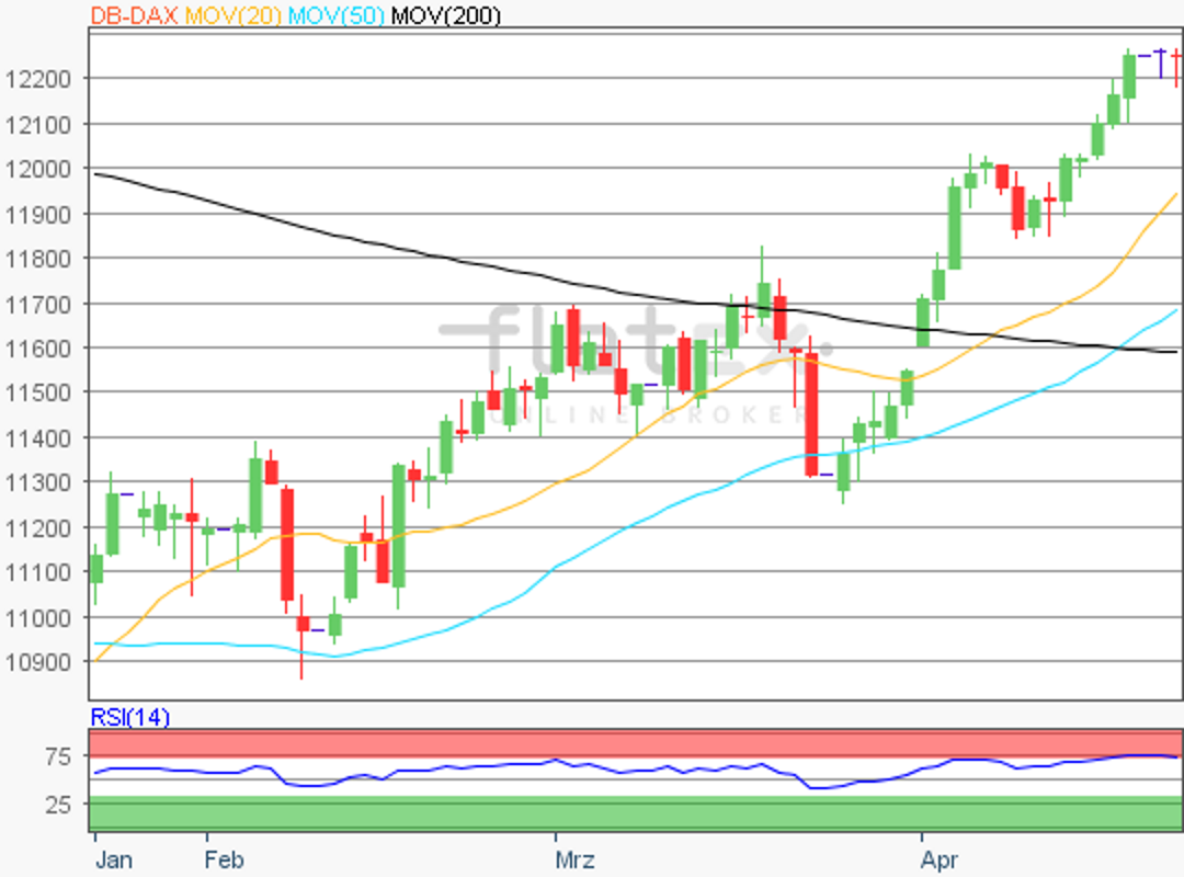 Der Deutsche Aktienindex konnte am Dienstag den achten Handelstag in Folge einen Kursgewinn erzielen. Zum Xetra-Handelsschluss notierte der deutsche Leitindex mit einem Plus von 0,11 Prozent und 12.235,51 Punkten. Das Handelsvolumen via Xetra und Börse Frankfurt betrug rund 3,48 Mrd. Euro.