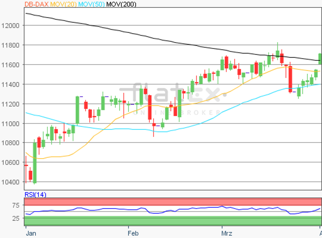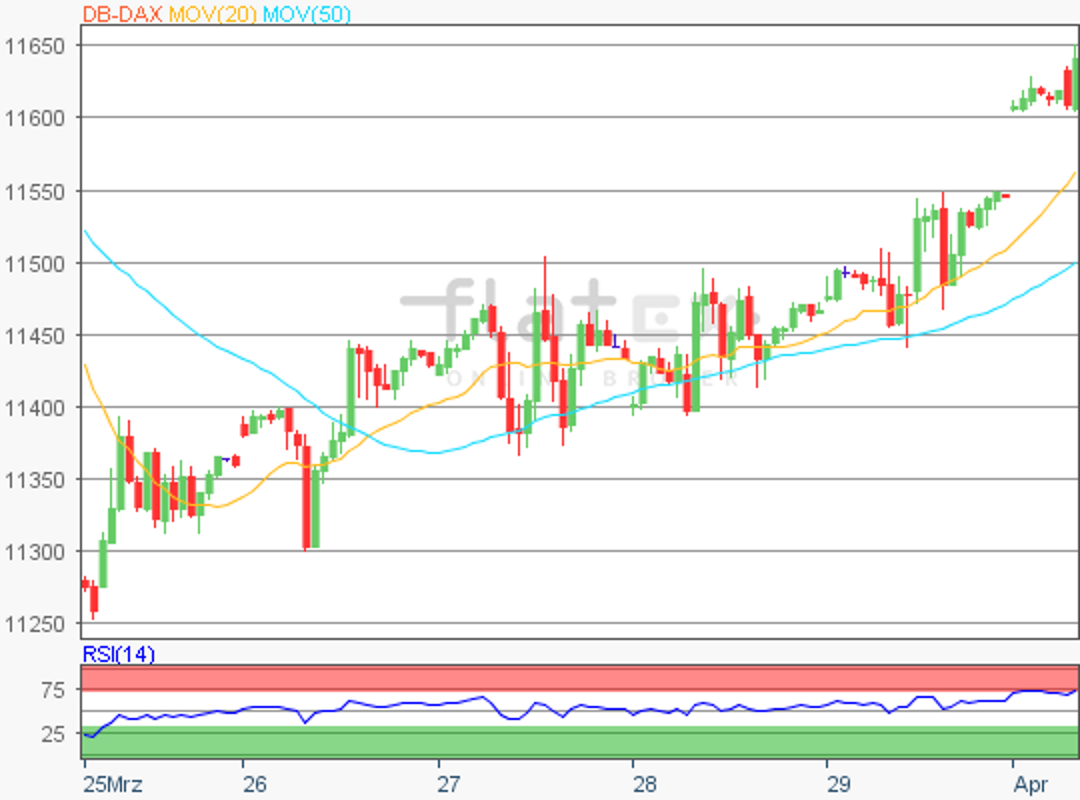Der Deutsche Aktienindex startete mit einem ordentlichen Kursplus in das neue Quartal. Zum Xetra-Handelsschluss notierte der deutsche Leitindex mit einem Zugewinn von 1,35 Prozent bei 11.681,99 Punkten.