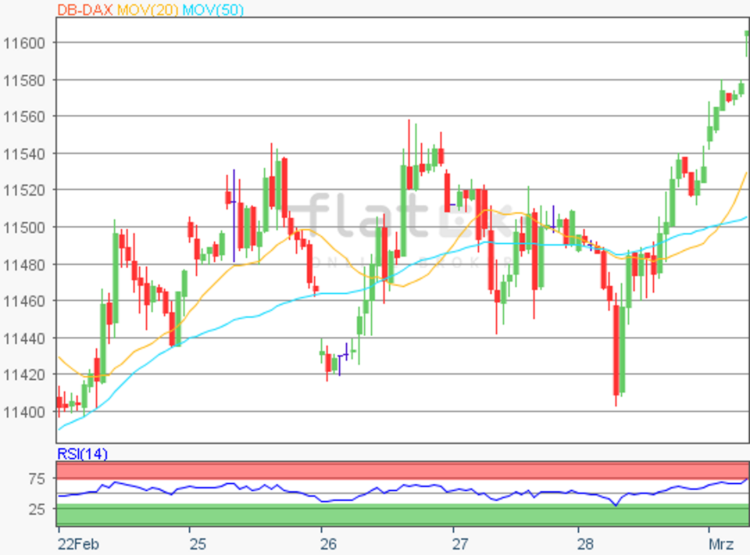 Der Deutsche Aktienindex beendete den Xetra-Handel am Freitag mit einem Plus von 0,75 Prozent bei 11.601,68 Punkten. Das Handelsvolumen via Xetra und Börse Frankfurt betrug rund 3,43 Mrd. Euro.