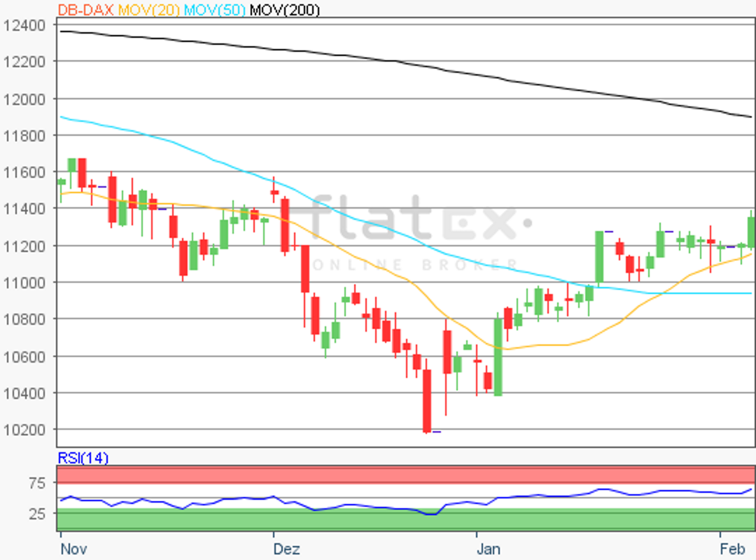 Der Deutsche Aktienindex konnte am Dienstag nach oben ausbrechen. Dabei konnte der DAX das bis dato geltende Doppel-Top aus dem Hoch vom 25. Januar 2019 von 11.321,62 Punkten und dem Hoch vom 31. Januar 2019 bei 11.311,37 Punkten, nach oben auflösen.