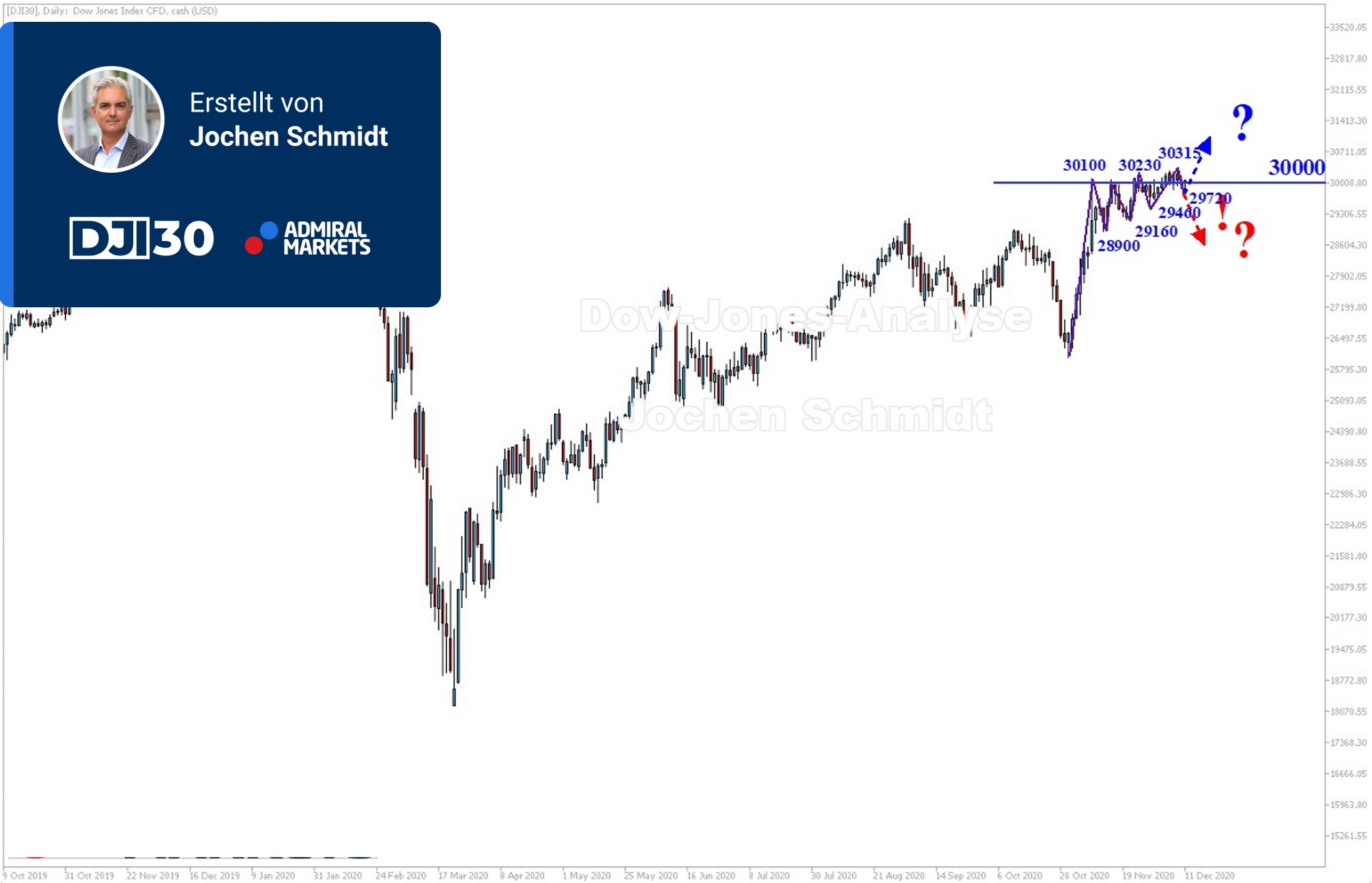 Dow Jones: Stillstand und Richtungssuche um die Marke von 30.000 im Dow | Chartanalyse | Markttechnik | Daytrading | CFD