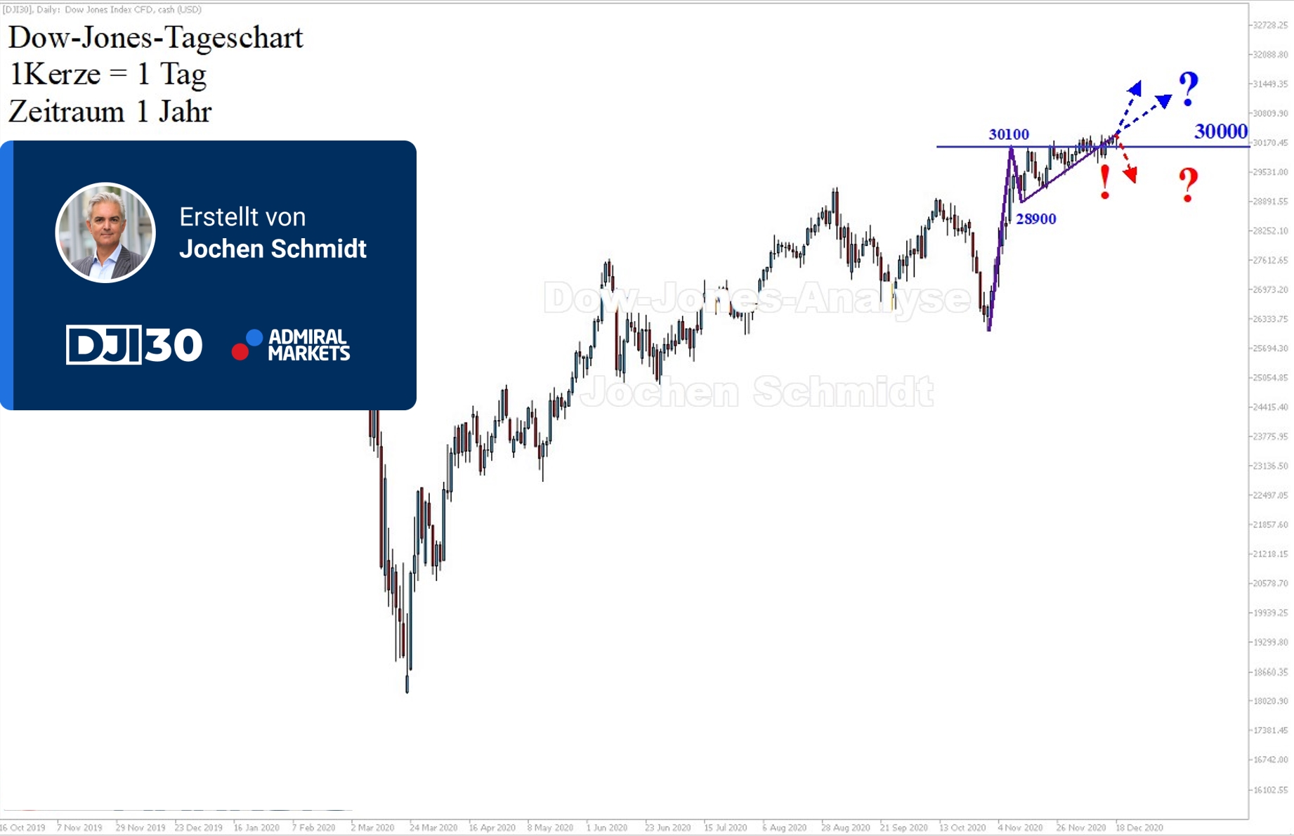 Dow Jones Analyse: Falls weiterhin mehr Käufe als Verkäufe in diesen Markt strömen, ist es durchaus denkbar, dass die 31.000er-Marke nochmals angehandelt und/oder überschritten werden kann. Immer neue All-time-Highs im Dow Jones sind die Folge. Chartanalyse | Wochenausblick | Wichtige Kursmarken
