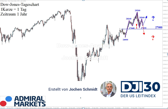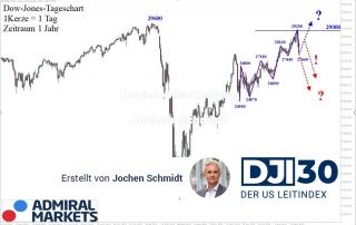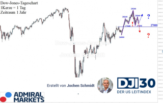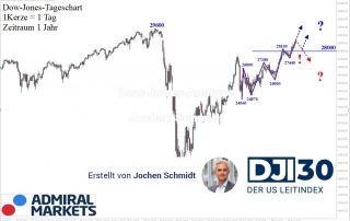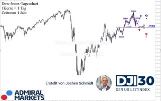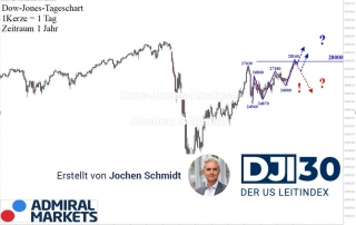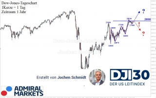 Dow Jones Chartanalyse nach der Markttechnik: Sollten die Kurse sich um die „28.000" halten können, sind weitere Anstiege denkbar.