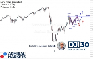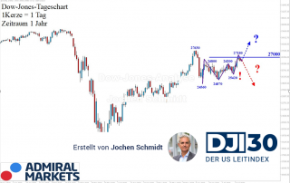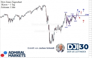 Dow Jones Wochenanalyse nach Markttechnik: Dow Jones Analyse: Es existiert hohe Wahrscheinlichkeit, dass die Kurse, vielleicht auch per Lückensprung, an oder über die 27.630 laufen können.