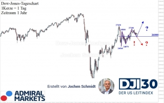 Dow Jones Analyse nach Markttechnik: Der Aufwärtstrend im Dow ist intakt und befindet sich in einer Korrekturphase, die punktgenau an der 26.000-er Marke aufsetzt.