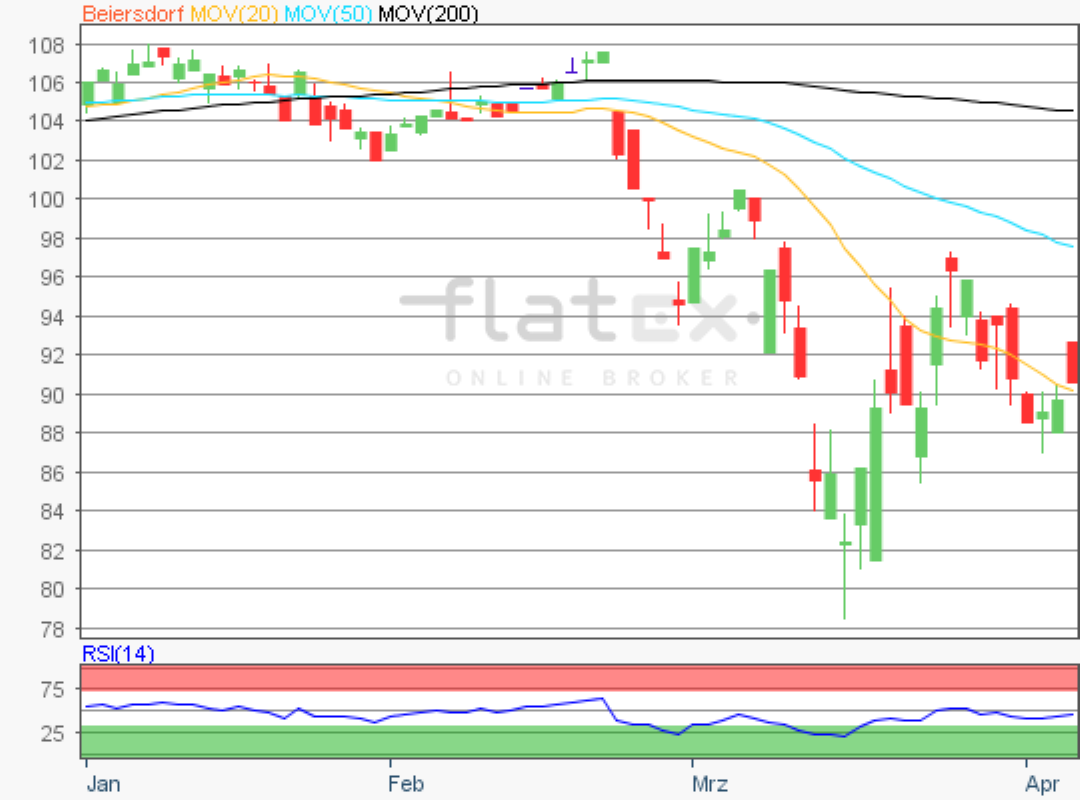Die Aktie des DAX-Konzerns Beiersdorf notierte am 16. März 2020 auf einem Verlaufstief von 77,62 Euro. Bis zum 25. März 2020 erholte sich das Wertpapier kurzfristig auf ein jüngstes Zwischenhoch von 98,00 Euro.