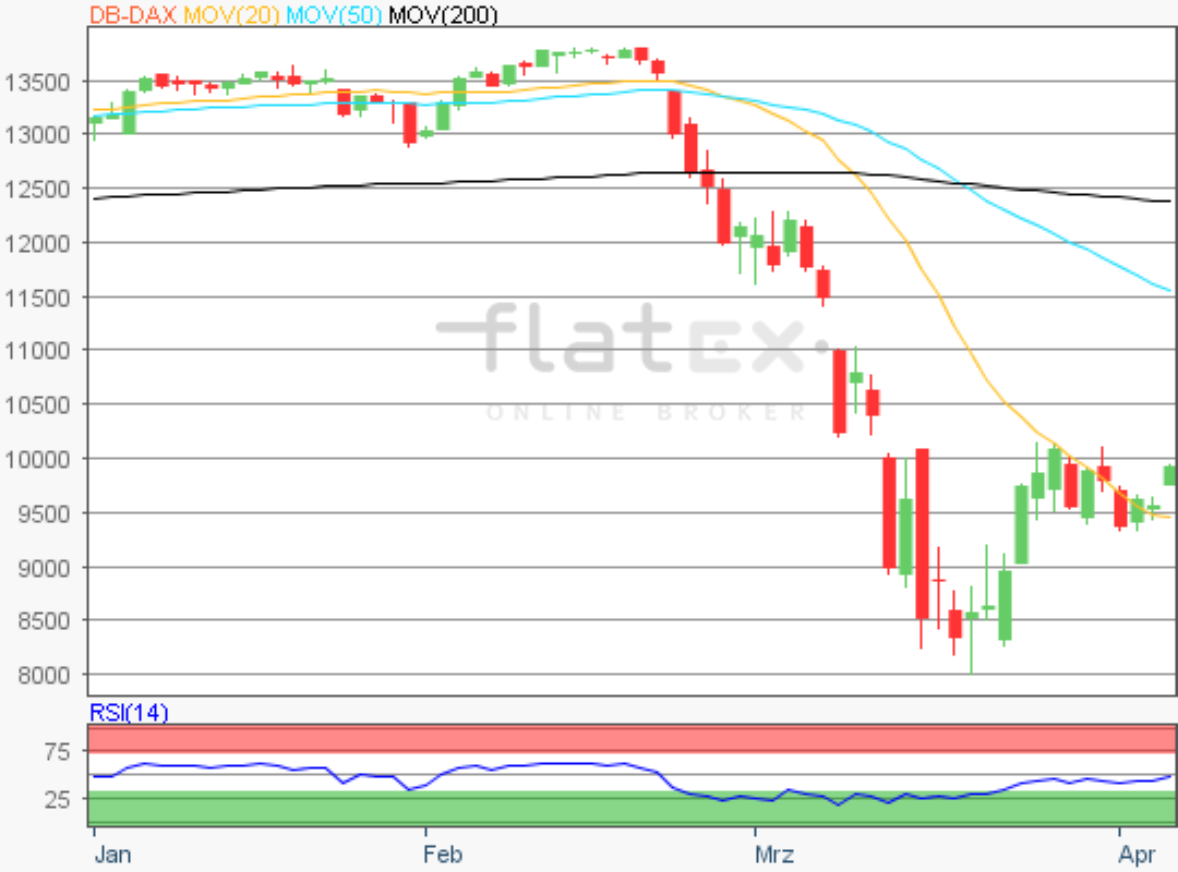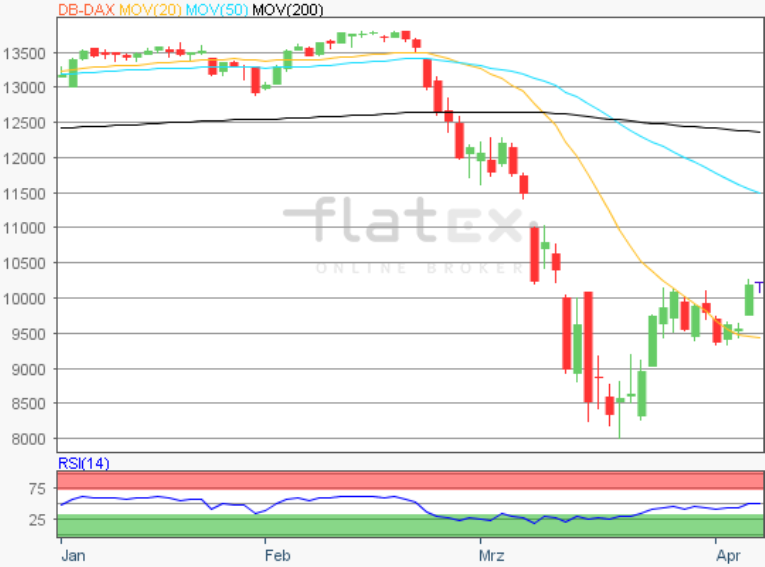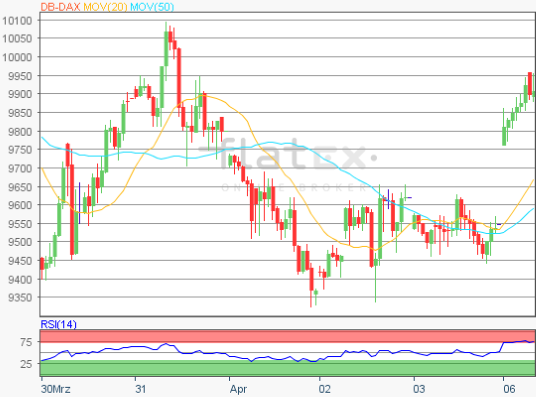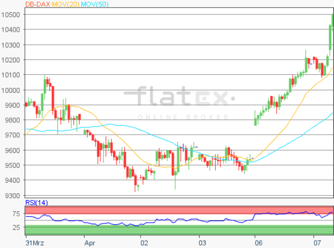 Der Deutsche Aktienindex startete raketenhaft in die neue Börsenwoche. Zum Xetra-Handelsende notierte der deutsche Leitindex mit einem enorm starken Kursplus von 5,77 Prozent bei 10.075,17 Punkten.