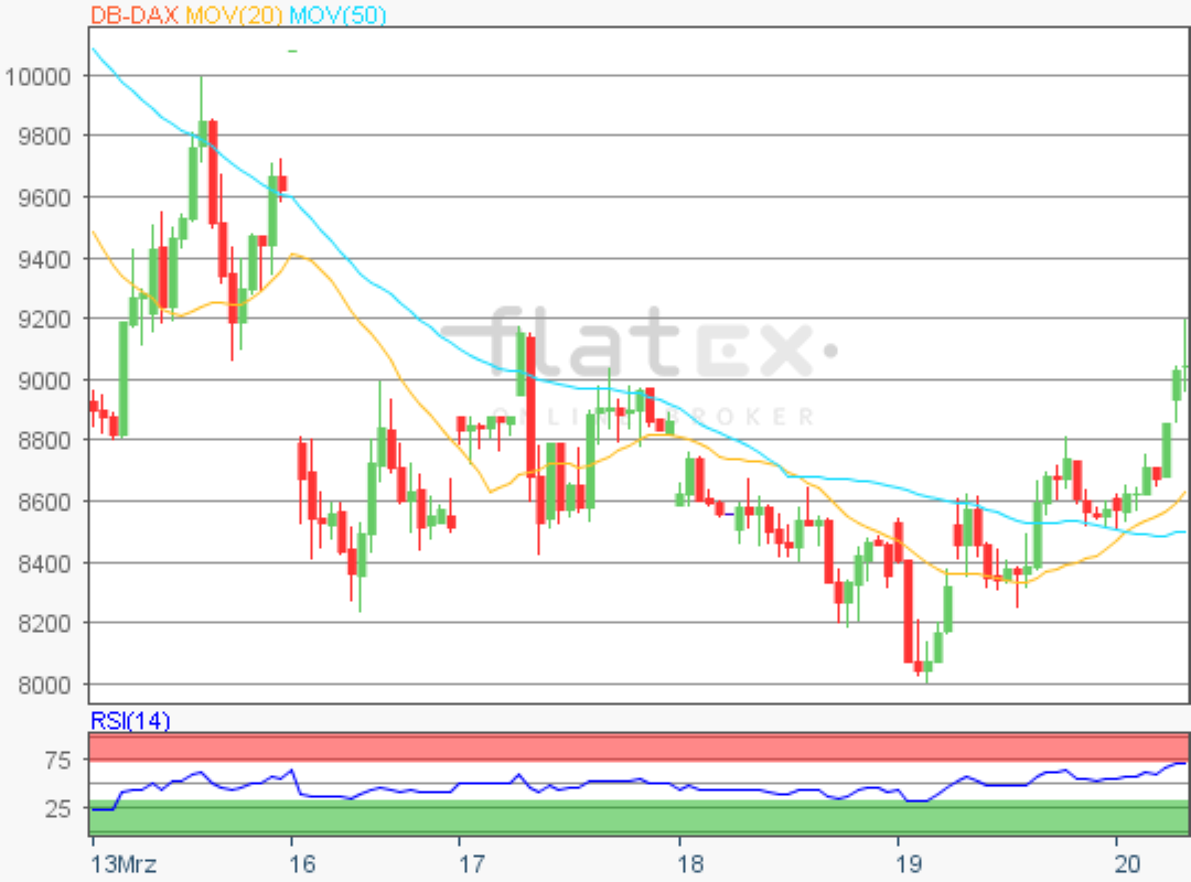Der Deutsche Aktienindex schloss am Freitag via Xetra mit einem Kursgewinn von 3,70 Prozent bei 8.928,95 Punkten. Das Handelsvolumen via Xetra und Börse Frankfurt betrug rund 9,56 Milliarden Euro. Auch die restlichen umsatzstarken europäischen Indizes konnten sich durchweg erholen.
