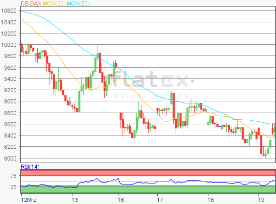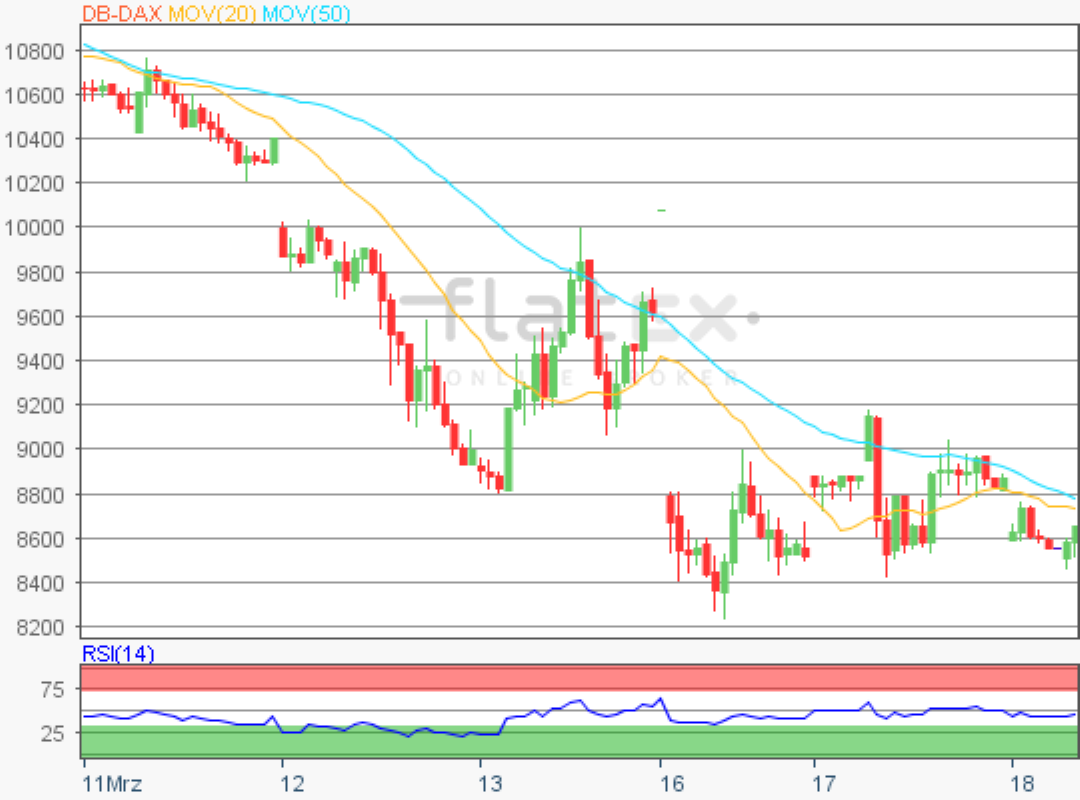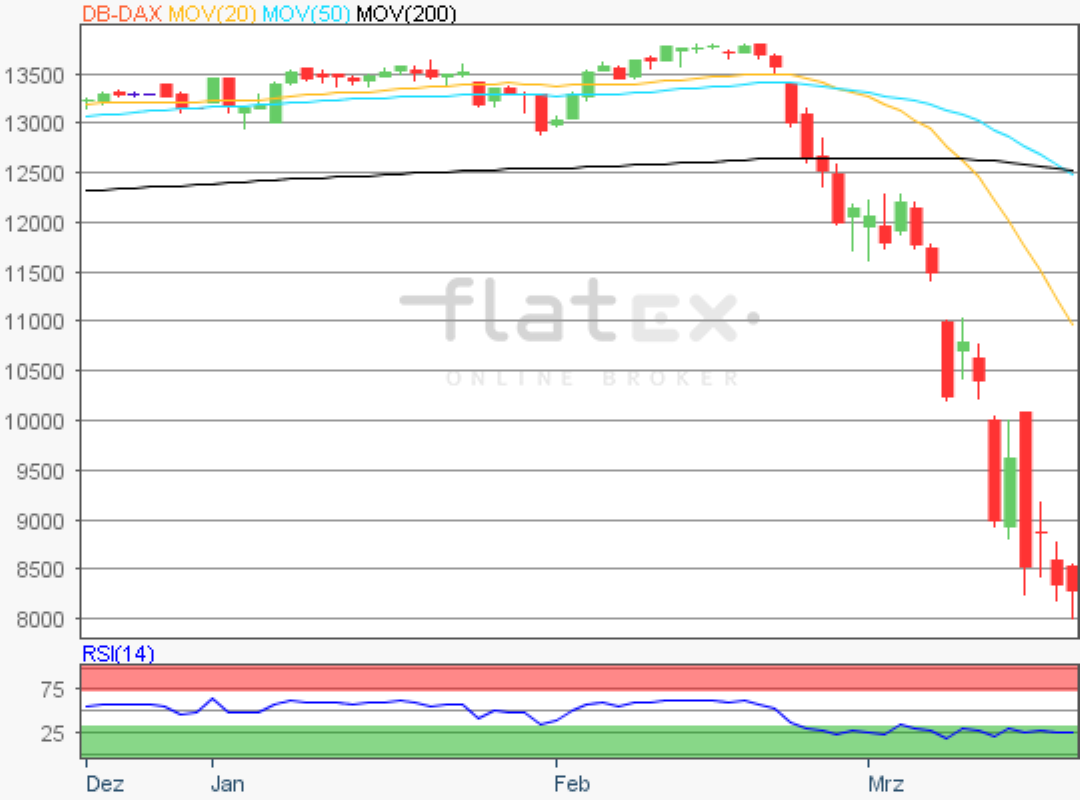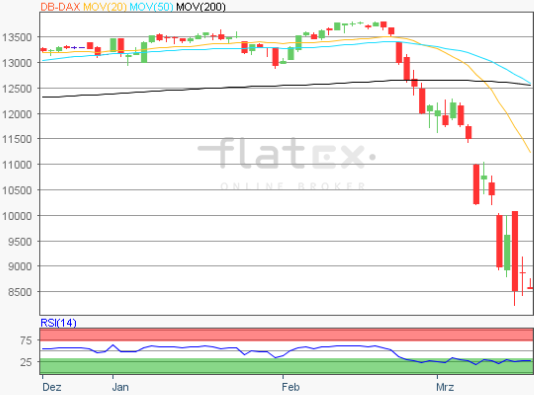 Der Deutsche Aktienindex schloss am Mittwoch via Xetra mit einem Kursverlust von 5,56 Prozent bei 8.441,71 Punkten. Das Handelsvolumen via Xetra und Börse Frankfurt betrug 6,57 Milliarden Euro.