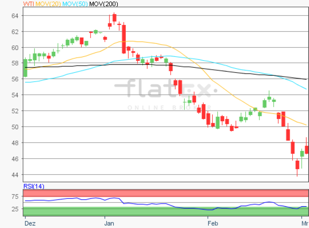 Der Preis für ein Fass Rohöl der US-Sorte WTI im April-Kontrakt an der US-Terminbörse NYMEX konnte sich rund um die massive Kauflaune an den Aktienmärkten zunächst kräftiger bis auf 48,64 US-Dollar je Fass erholen.
