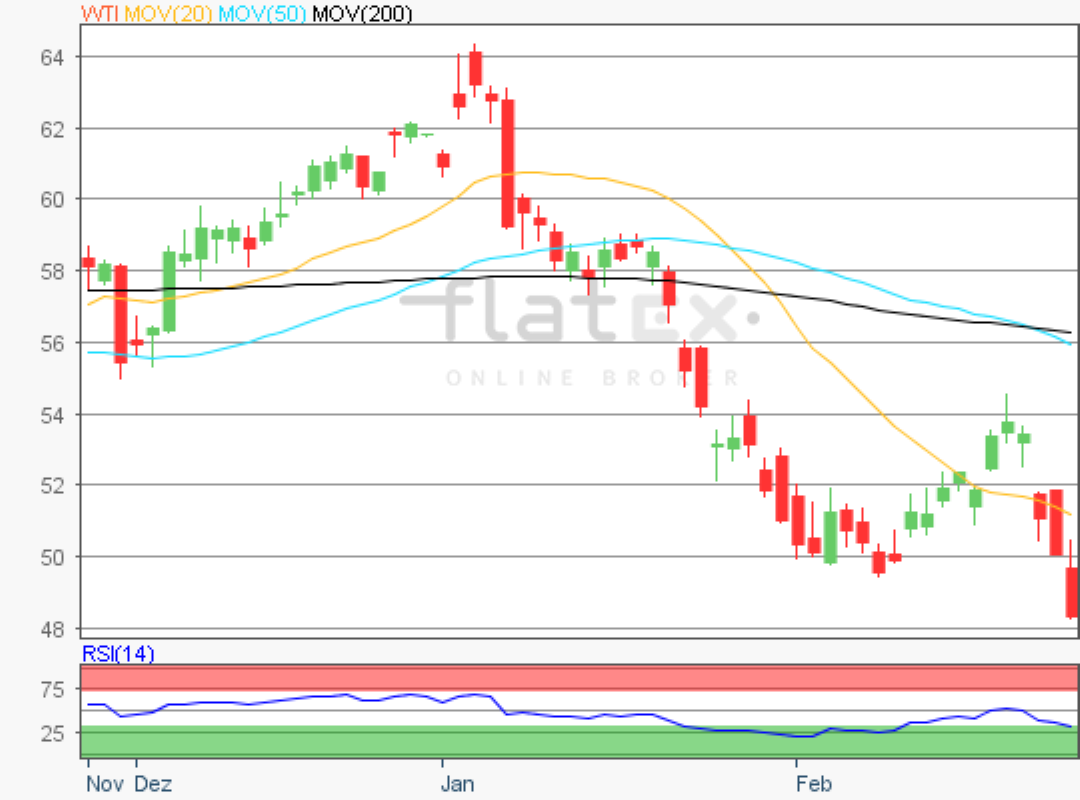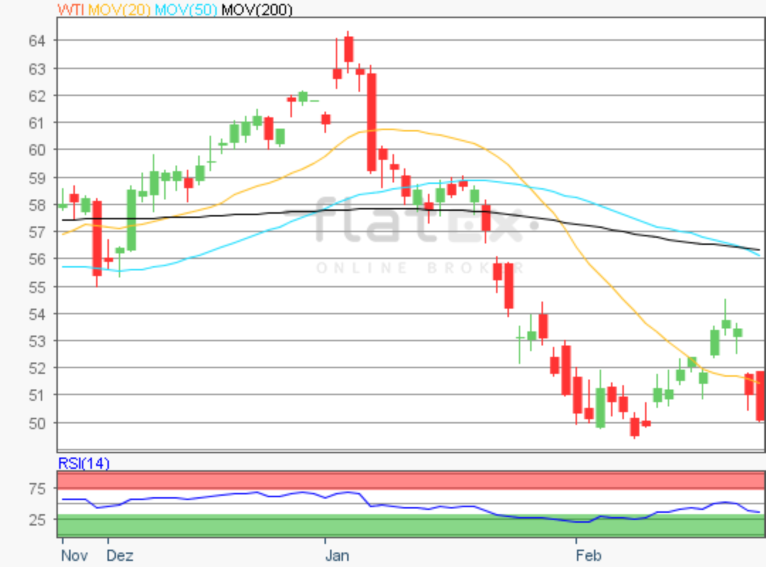 Der Preis für ein Fass Rohöl der US-Sorte WTI fiel deckungsgleich mit den vier „bearishen“ Handelstagen der global wichtigsten Aktienmärkte.