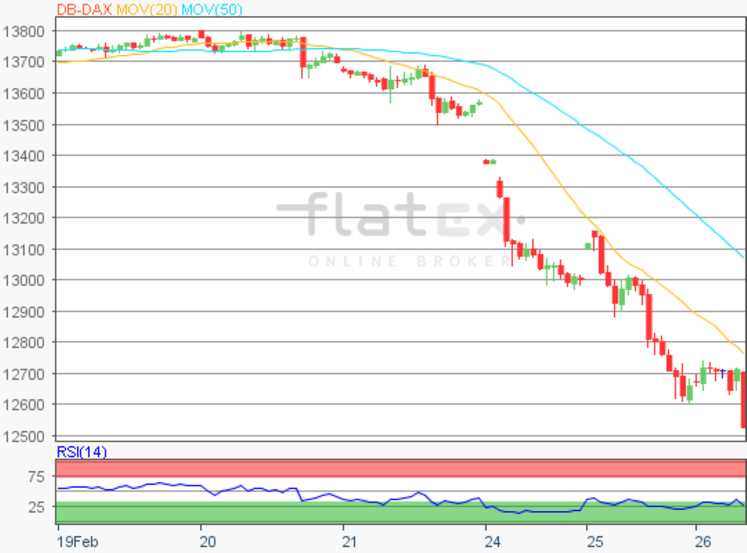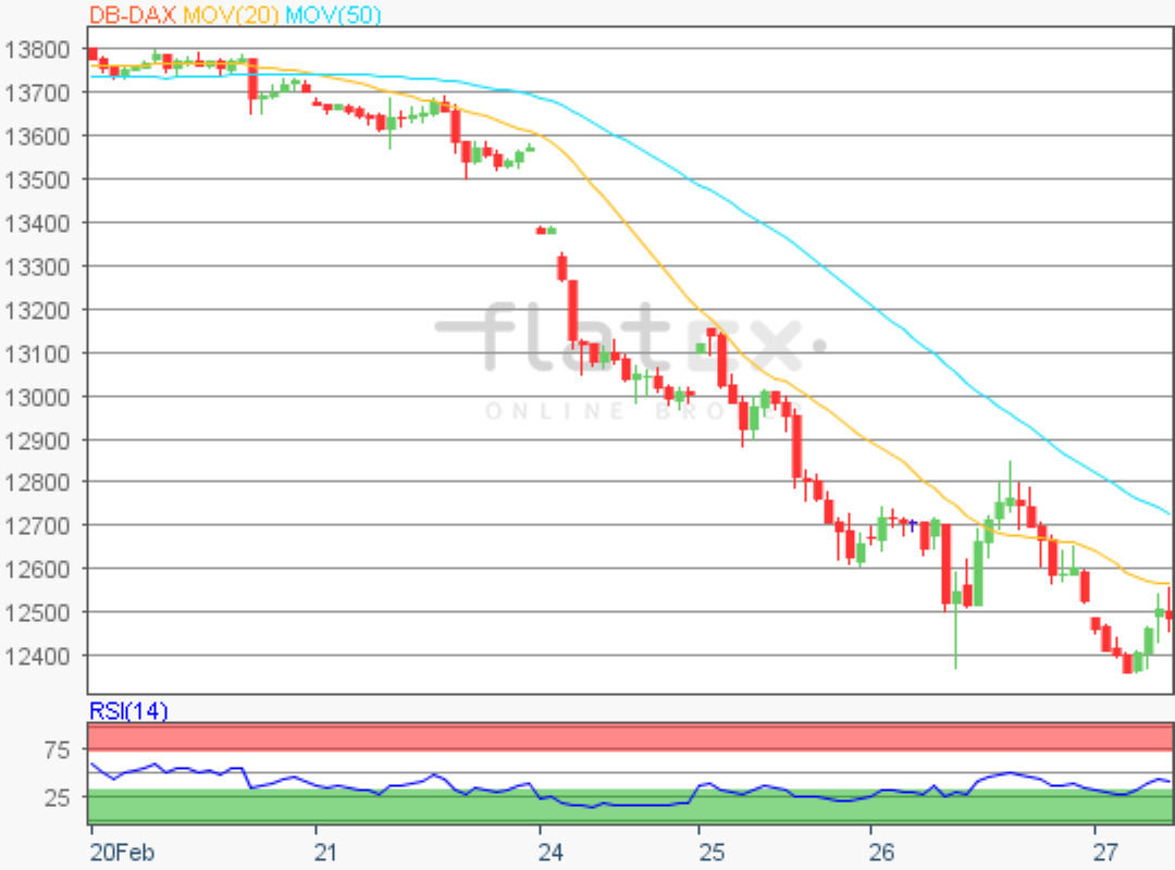 Der Deutsche Aktienindex schloss am Mittwoch nach einem hochvolatilen Handelstag via Xetra mit einem nur leichten Kursverlust von 12.774,88 Punkten. Die Handelsspanne vom Tageshoch von 12.849,17 Punkten bis zum Tagestief von 12.368,05 Punkten betrug 481,12 Indexpunkte.