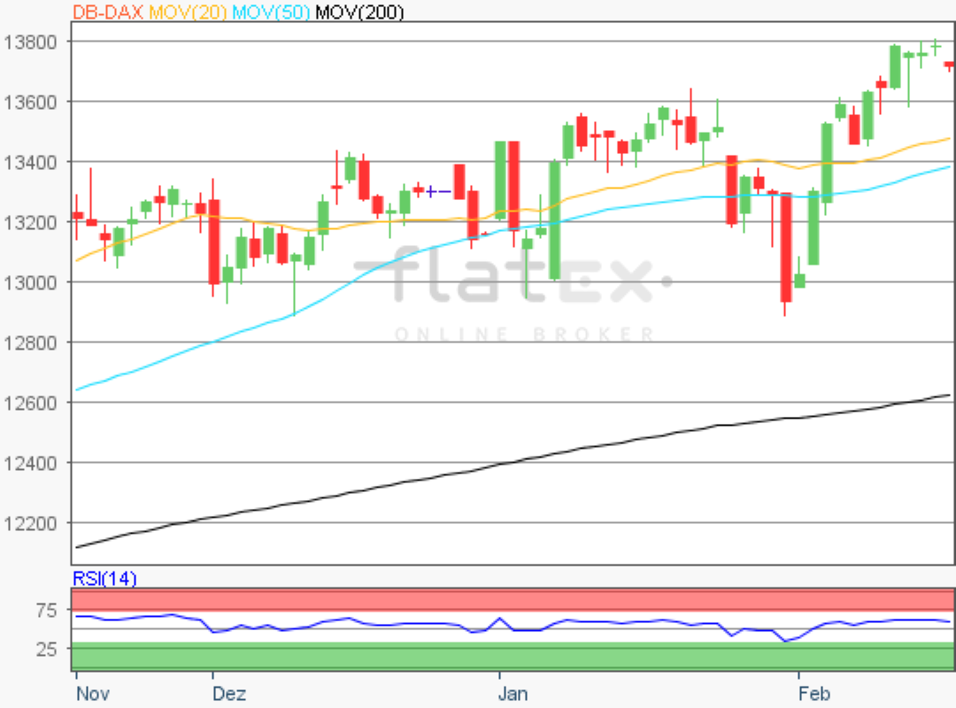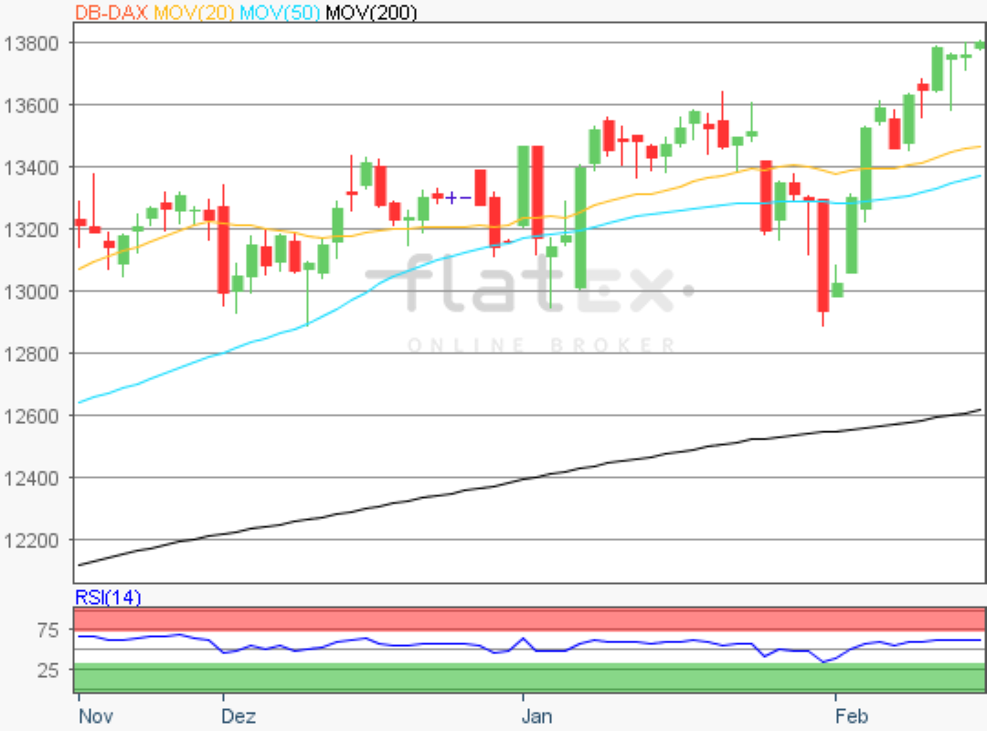 Der Deutsche Aktienindex konnte gleich zum Wochenbeginn mit 13.79524 Punkten ein neues Allzeithoch erreichen. Zum Xetra-Handelsende notierte der DAX dann mit einem Plus von 0,29 Prozent bei 13.783,89 Punkten.