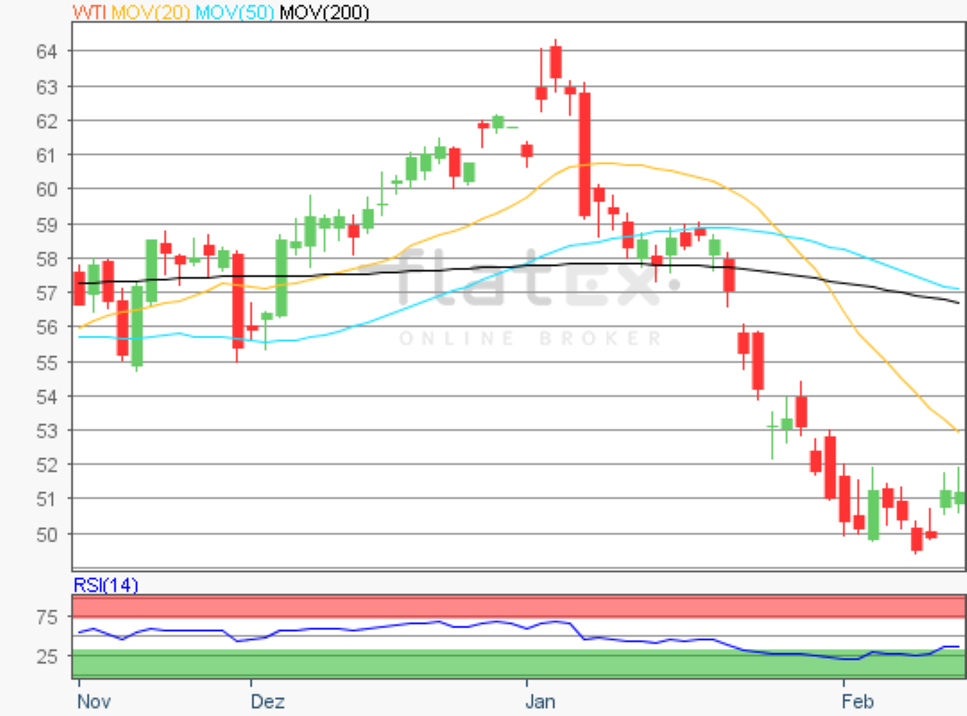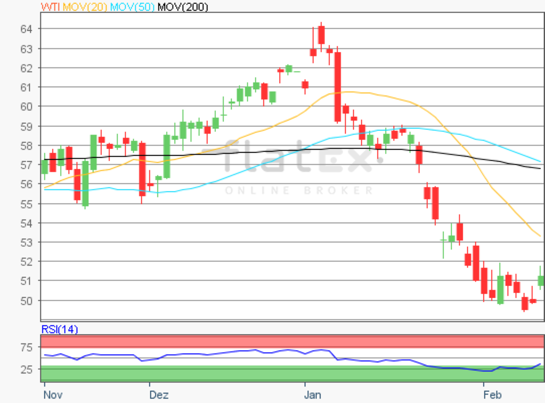 Der Preis für ein Fass Rohöl der US-Sorte WTI (West Texas Intermediate) im April-Kontrakt an der US-Terminbörse NYMEX fiel seit dem Bekanntwerden eines um rund 20prozentigen Nachfrageeinbruchs in China von 64,99 bis 49,52 US-Dollar um damit in der Spitze um über 31 Prozent.