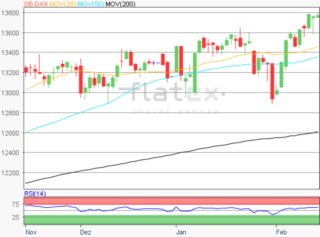 Der deutsche Leitindex knüpfte am Mittwoch dort an, wo er am Dienstag pausiert hatte, nämlich mit seiner Rekordfahrt. Das neue Allzeithoch via Xetra lautet nun 13.758,70 Punkte.