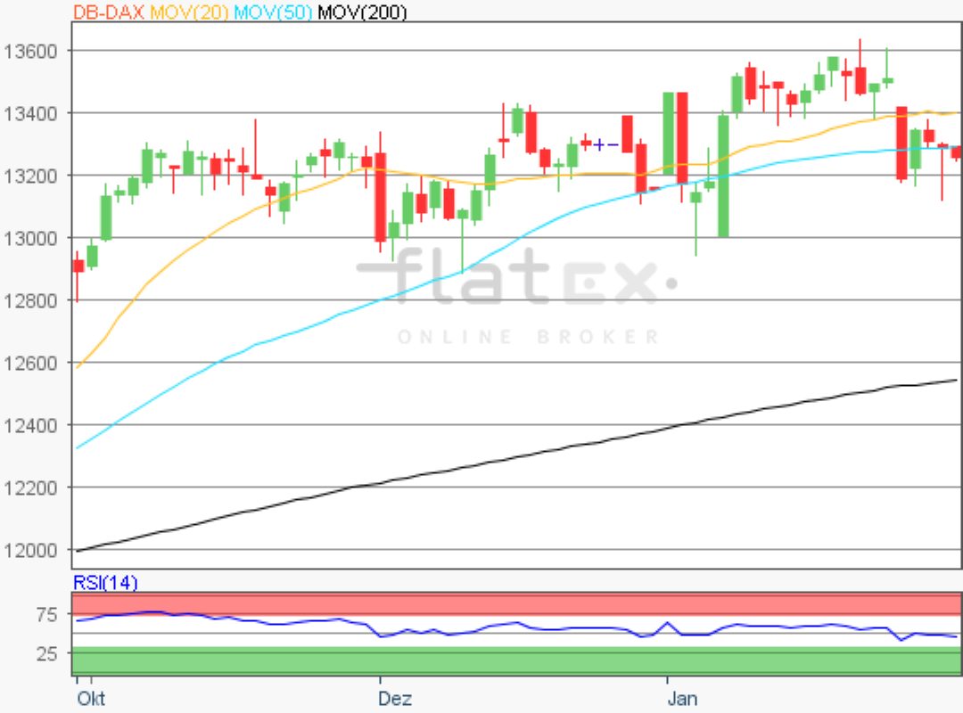 Der DAX ging am Montagmorgen der vergangenen Handelswoche bei 13.380 Punkten in den vorbörslichen Handel. Der Index notierte damit 147 Punkte unter der ersten vorbörslichen Notierung der Vorwoche aber 141 Punkte unter dem Wochenschluss am Freitag der Vorwoche. Der Index gab am Montag zunächst weiter nach. Er konnte sich aber im Bereich der 13.200 Punkte stabilisieren und am Dienstag wieder über die 13.300 Punkte laufen.