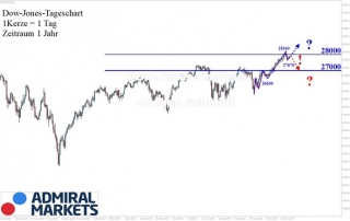 Dow Jones Analyse: Um die bereits jetzt recht ausgedehnte Bewegungsphase weiter nach Norden zu treiben, wäre es von Vorteil, wenn die 28.000er-Marke zügig überschritten und „gehalten" wird.