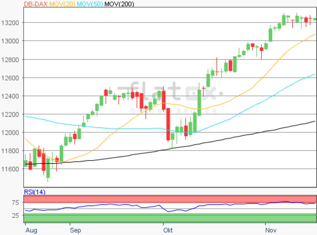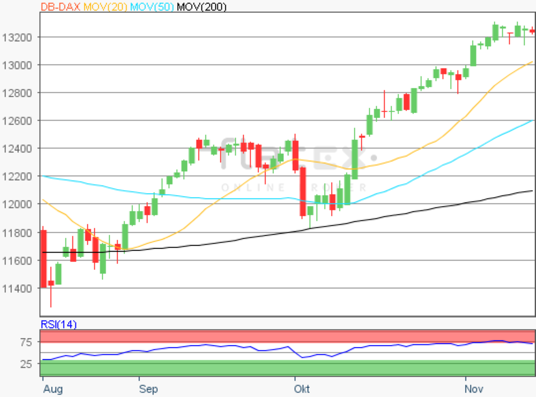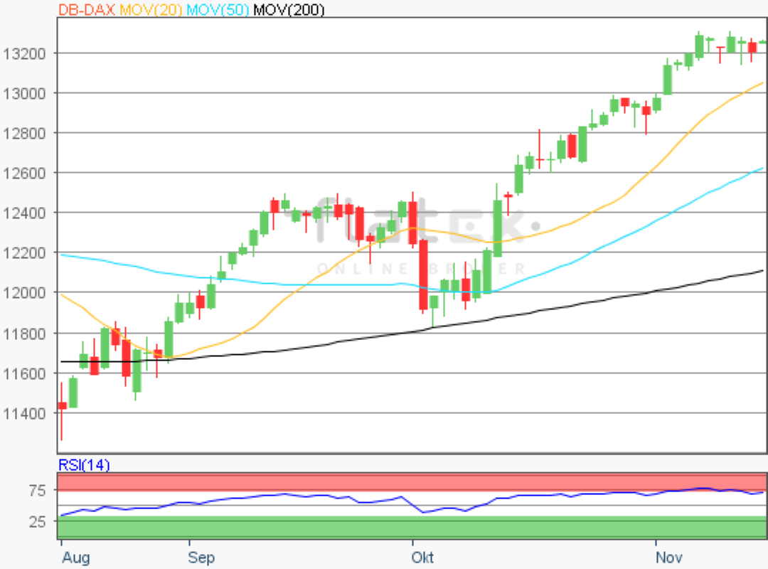 Zur Charttechnik: Der Deutsche Aktienindex schloss am Donnerstag via Xetra mit einem Kursverlust von 0,38 Prozent bei 13.180,23 Punkten.