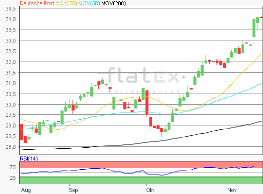 Die Aktie des DAX-Konzerns Deutsche Post notierte am 23. April 2019 mit 31,60 Euro auf einem letzten hier relevanten Zwischenhoch.