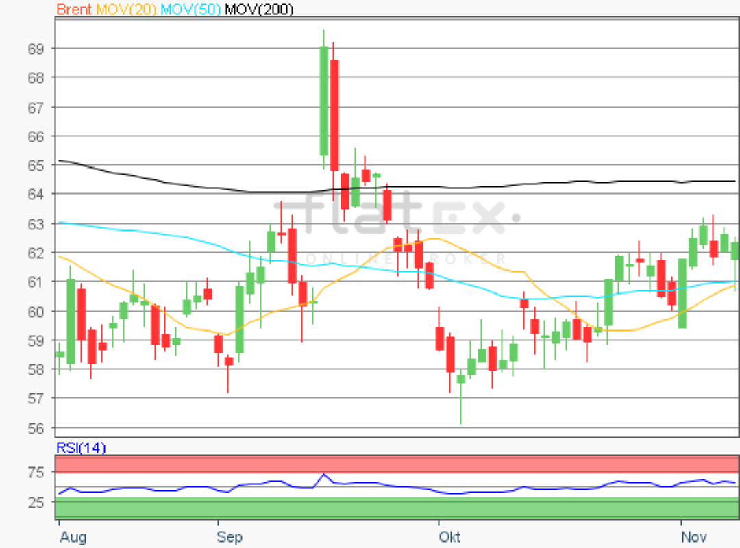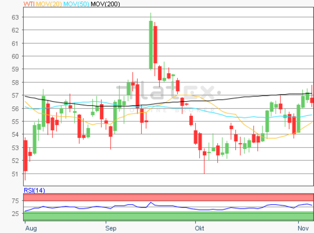 Der Preis für ein Fass Rohöl der Nordseesorte Brent an der Terminbörse ICE konnte sich von seinem Oktoberverlaufstief von 55,55 US-Dollar je Fass weiter entfernen.