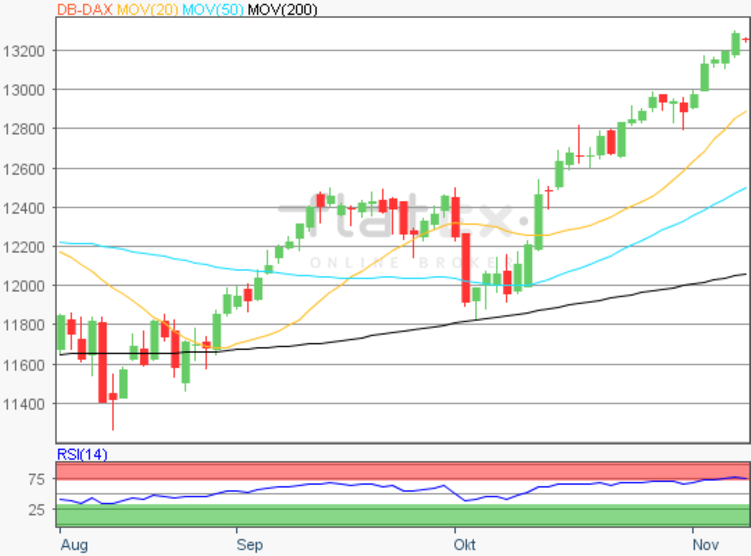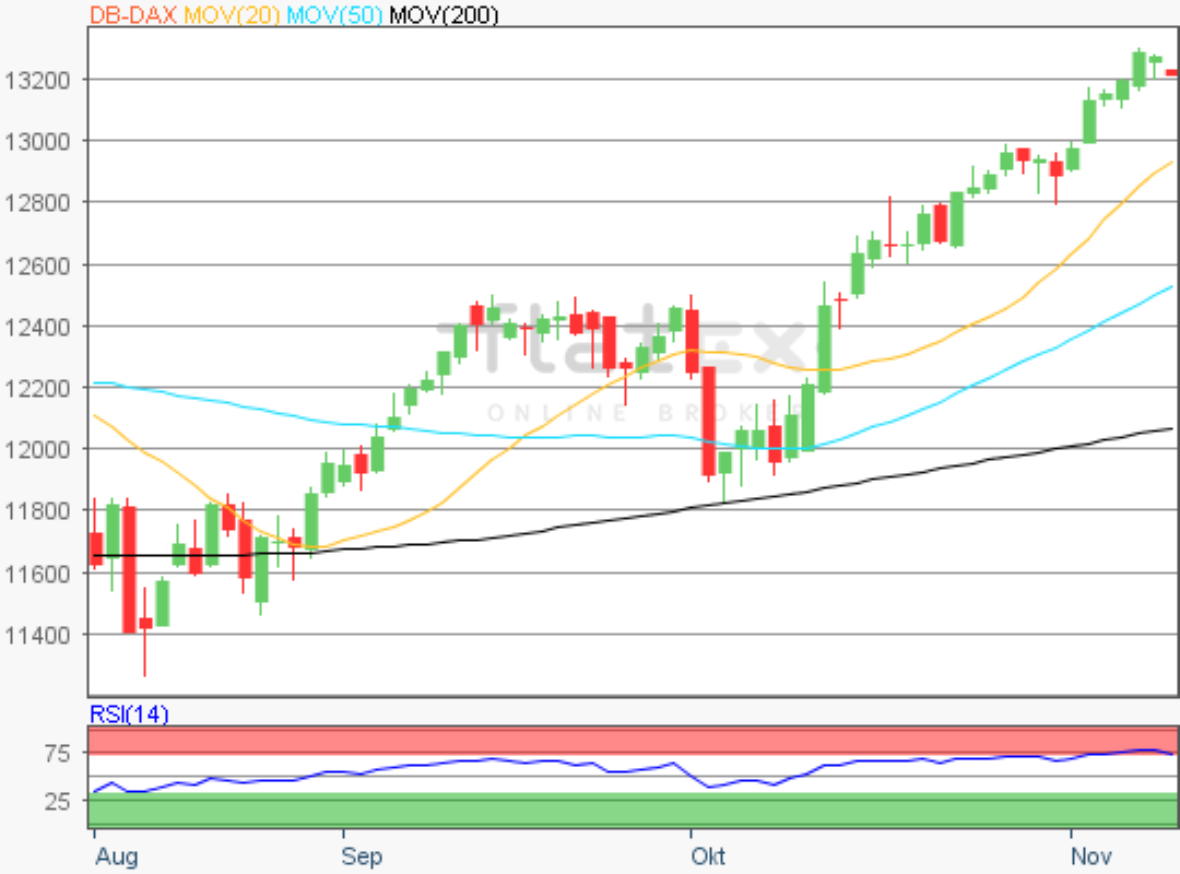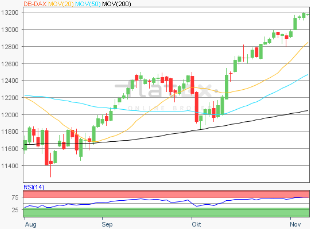 Der Deutsche Aktienindex stieg auch am Donnerstag nochmals an und konnte somit den fünften Handelstag in Folge zulegen. Zum Xetra-Schluss notierte der DAX mit einem Kursplus von 0,83 Prozent bei 13.289,46 Punkten. Das Handelsvolumen via Xetra und Börse Frankfurt betrug rund 4,77 Mrd. Euro.