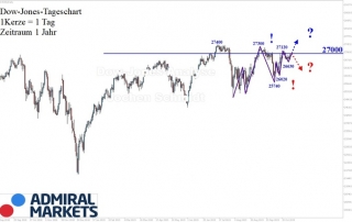 Dow Jones Analyse: Trotz des vorteilhaften bullischen Gesamtbildes kommt der „Dow" nicht richtig ins Laufen. Erst mit einer deutlichen Überwindung der 27.000 ist eine größere Trendfortsetzung denkbar.