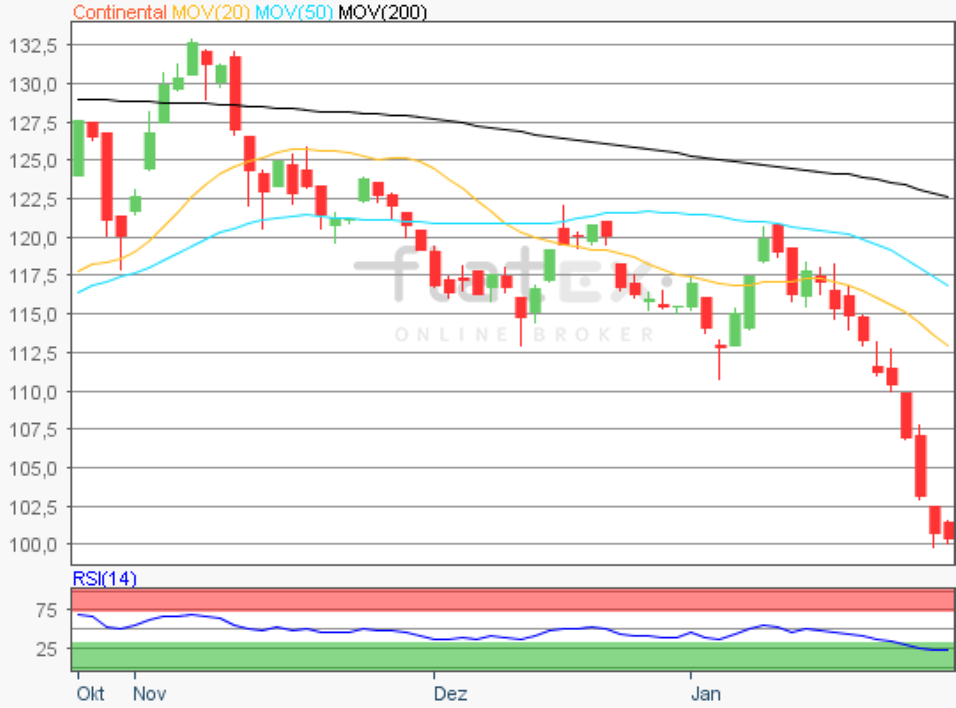 Die Aktie des DAX-Konzerns Continental notierte am 28. Januar 2020 auf einem letzten hier relevanten Verlaufstief von 99,26 Euro.