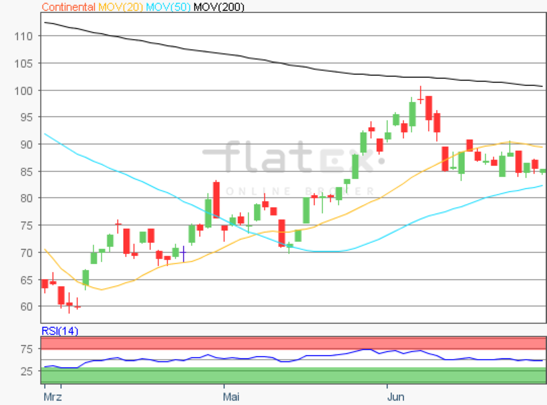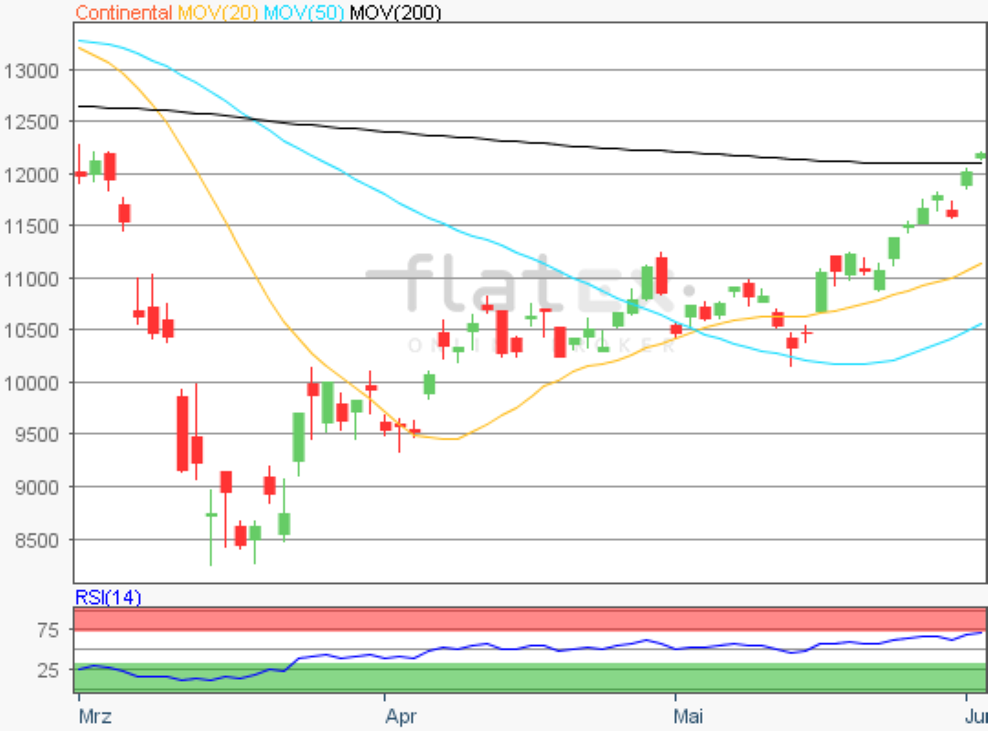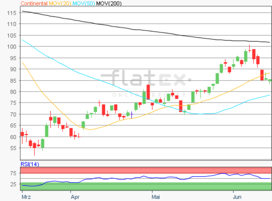 Die Aktie des DAX-Konzerns Continental notierte am 14. Mai 2020 auf einem hier relevanten Verlaufstief von 68,80 Euro.