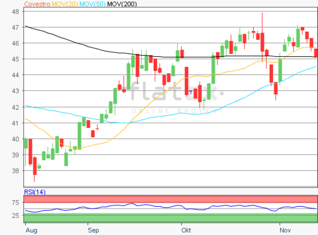 Die Aktie des DAX-Konzerns Covestro notierte am 28. Oktober 2019 auf einem letzten Zwischenhoch von 48,18 Euro.