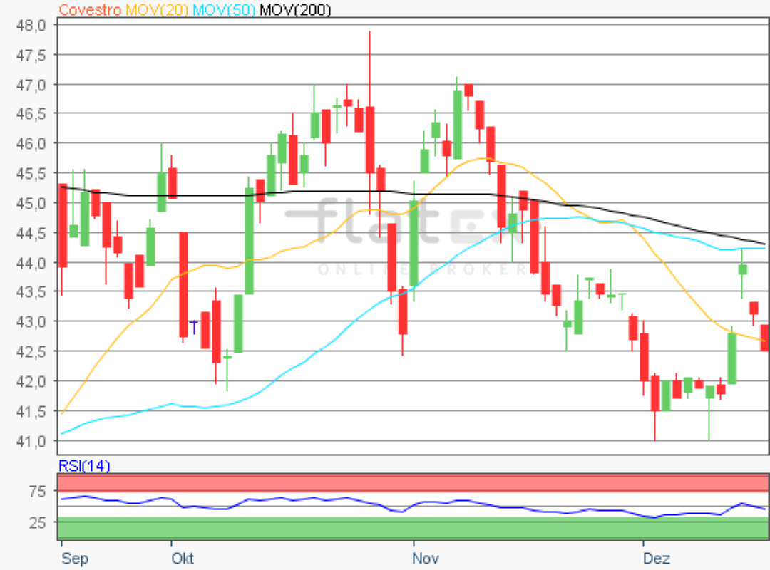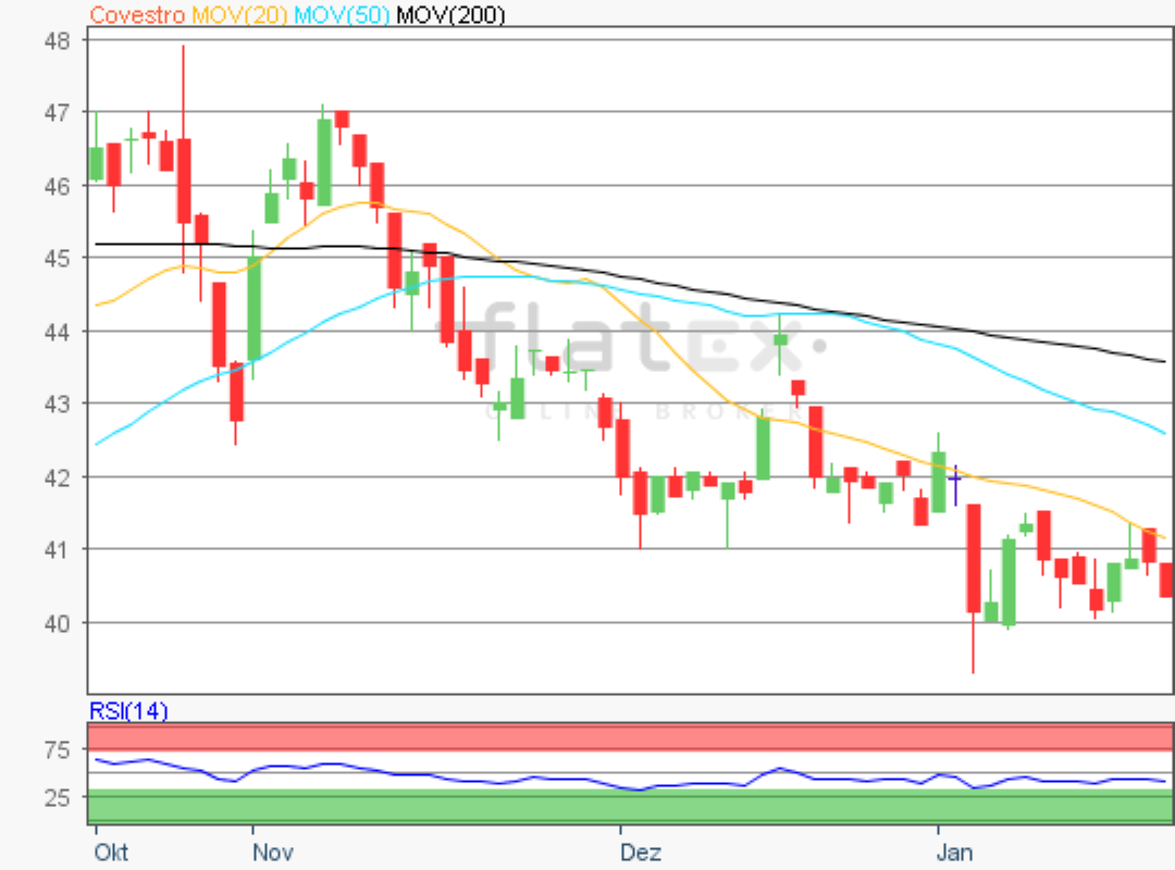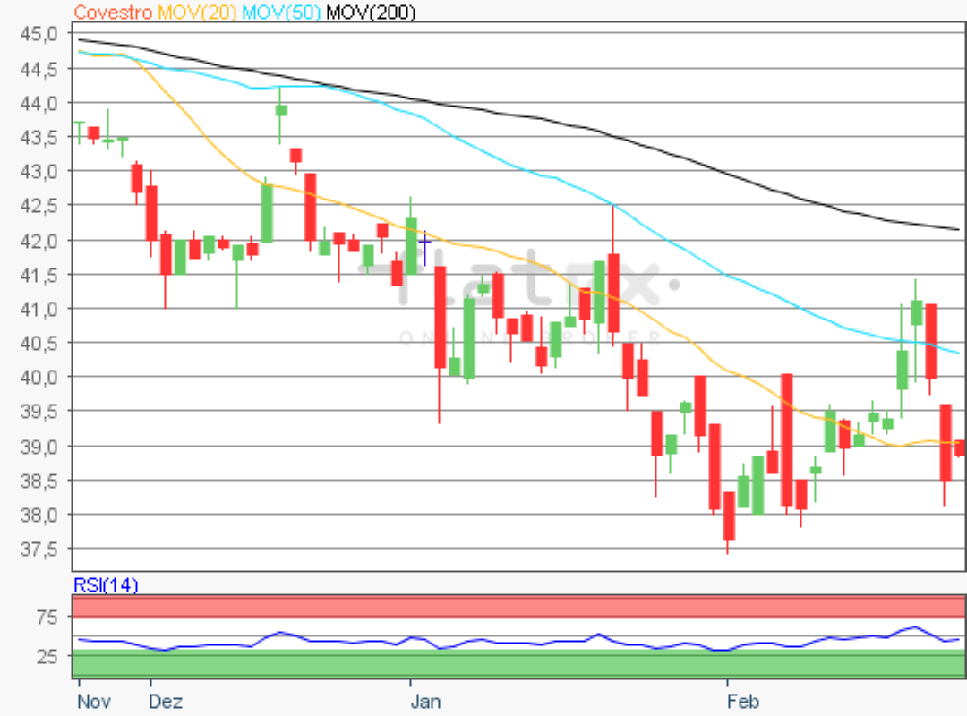 Die Aktie des DAX-Konzerns Covestro notierte am 20. Februar 2020 auf einem letzten Zwischenhoch von 41,54 Euro.