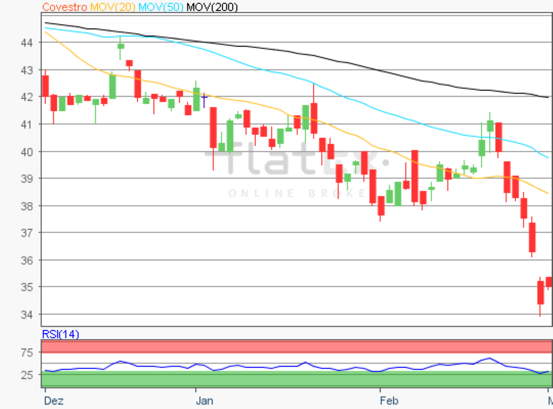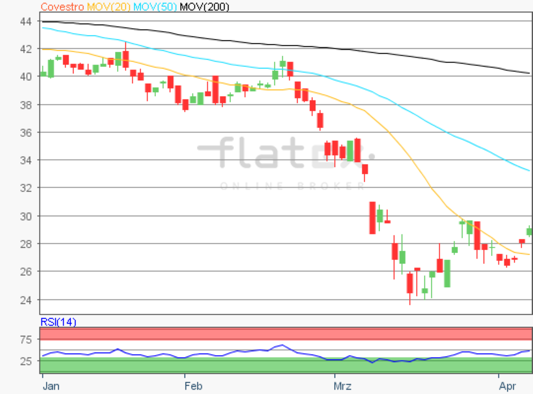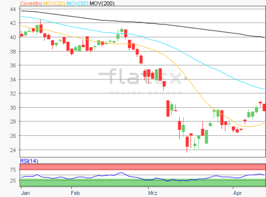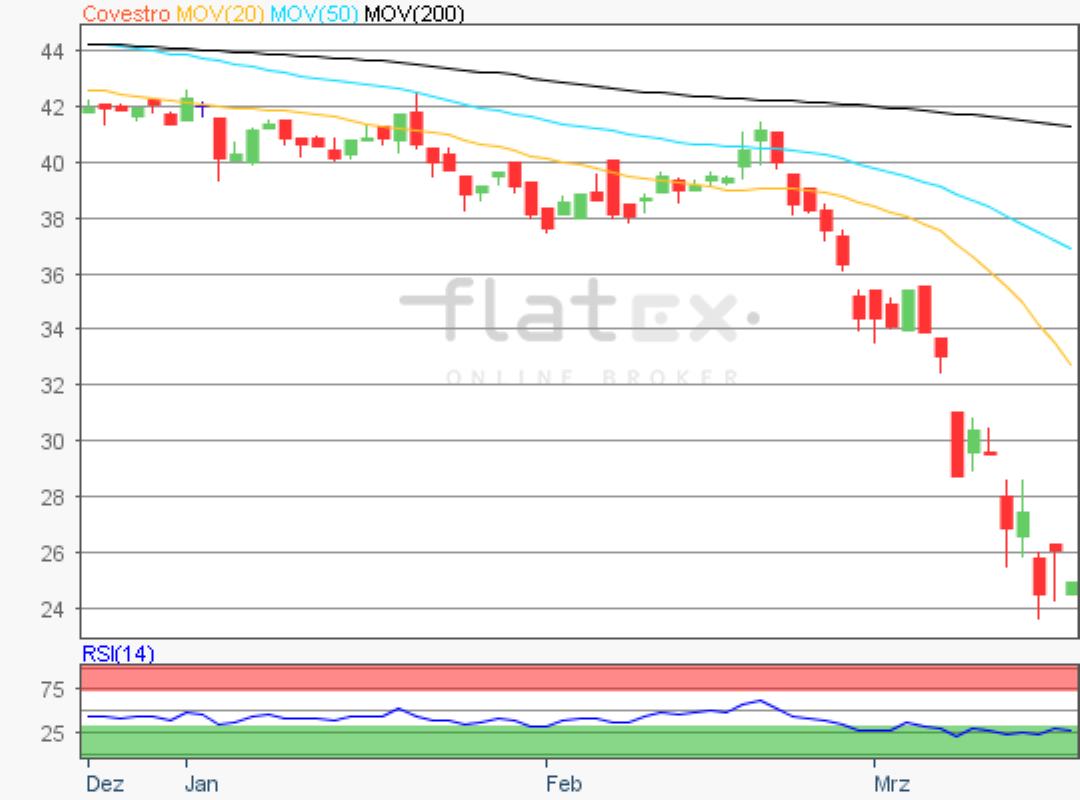 Die Aktie des DAX-Konzerns Covestro notierte am 16 März 2020 auf einem letzten Verlaufstief von 23,52 Euro.