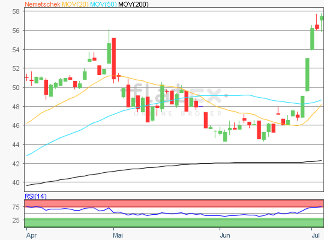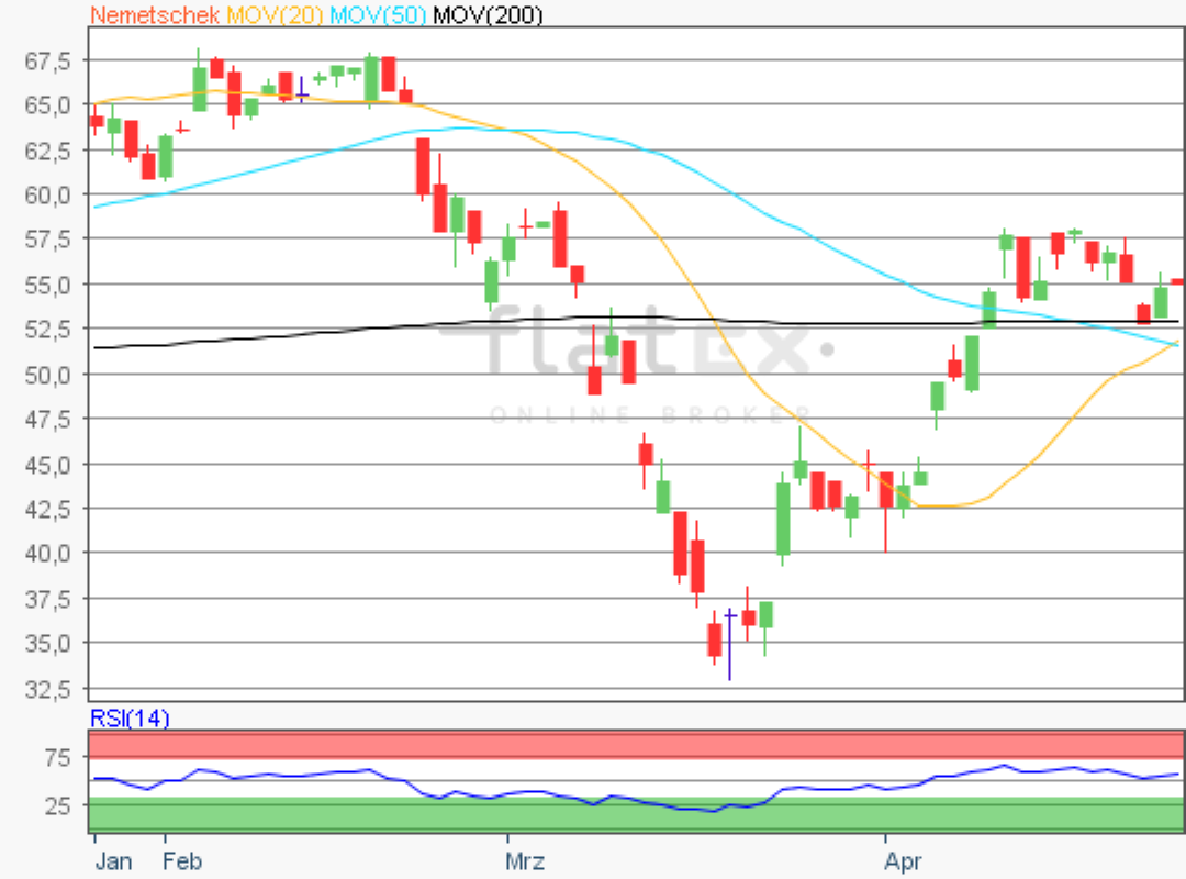 Die Aktie des TecDAX-Konzerns Nemetschek notierte am 30. April 2019 auf einem letzten Hoch von 56,70 Euro.