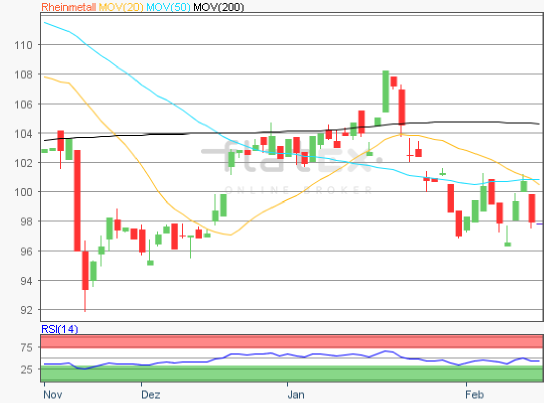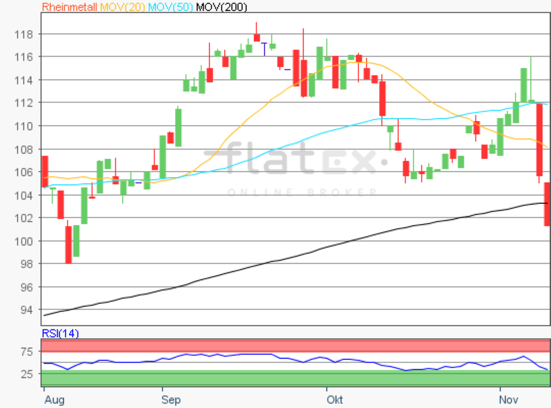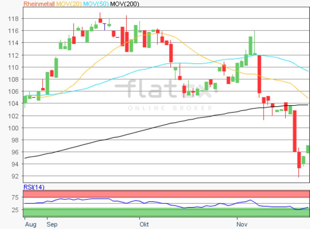 Die Aktie des MDAX-Konzerns Rheinmetall notierte am 21. November 2019 auf einem letzten hier relevanten Verlaufstief von 91,34 Euro.
