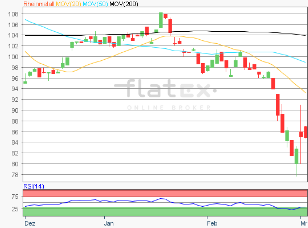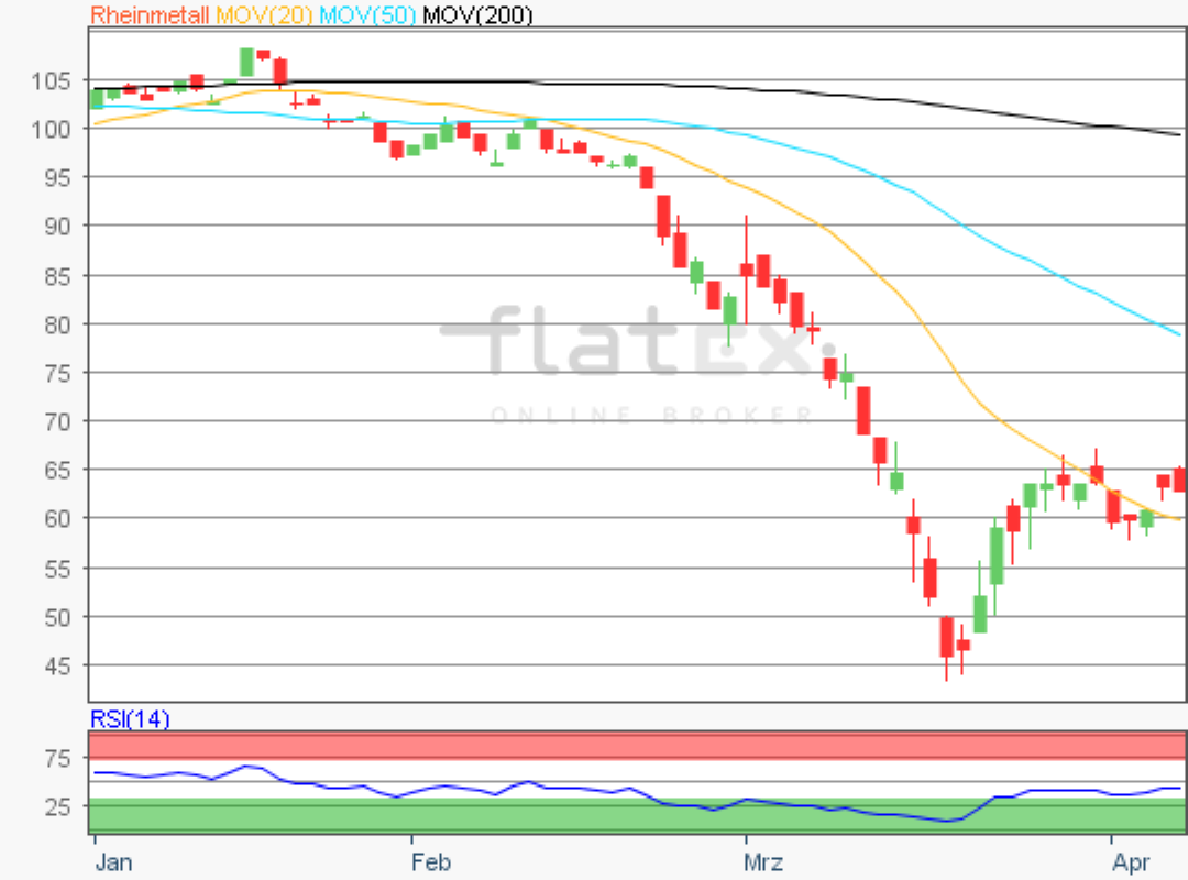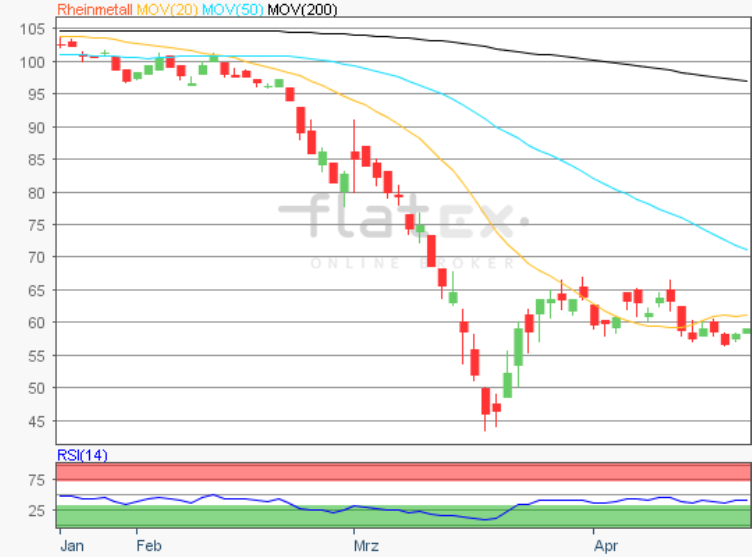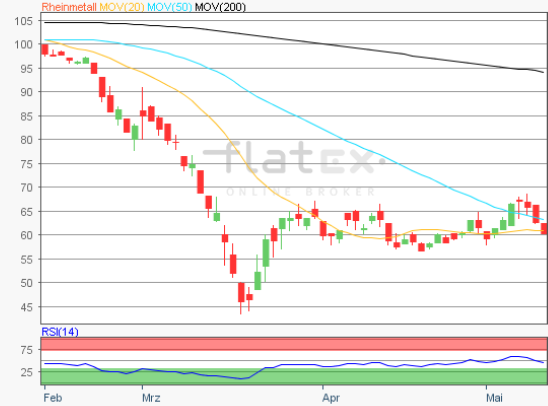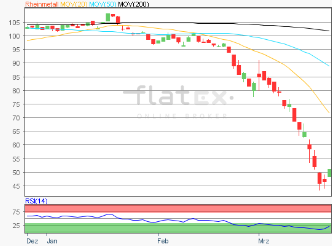 Die Aktie des MDAX-Konzerns Rheinmetall notierte am 19. März 2020 auf einem letzten Verlaufstief von 43,23 Euro.