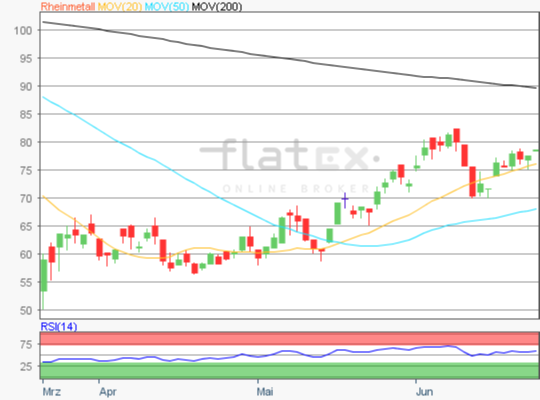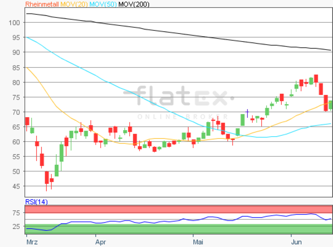 Die Aktie des MDAX-Konzerns Rheinmetall notierte am 08. Juni 2020 auf einem letzten Zwischenhoch von 81,96 Euro.