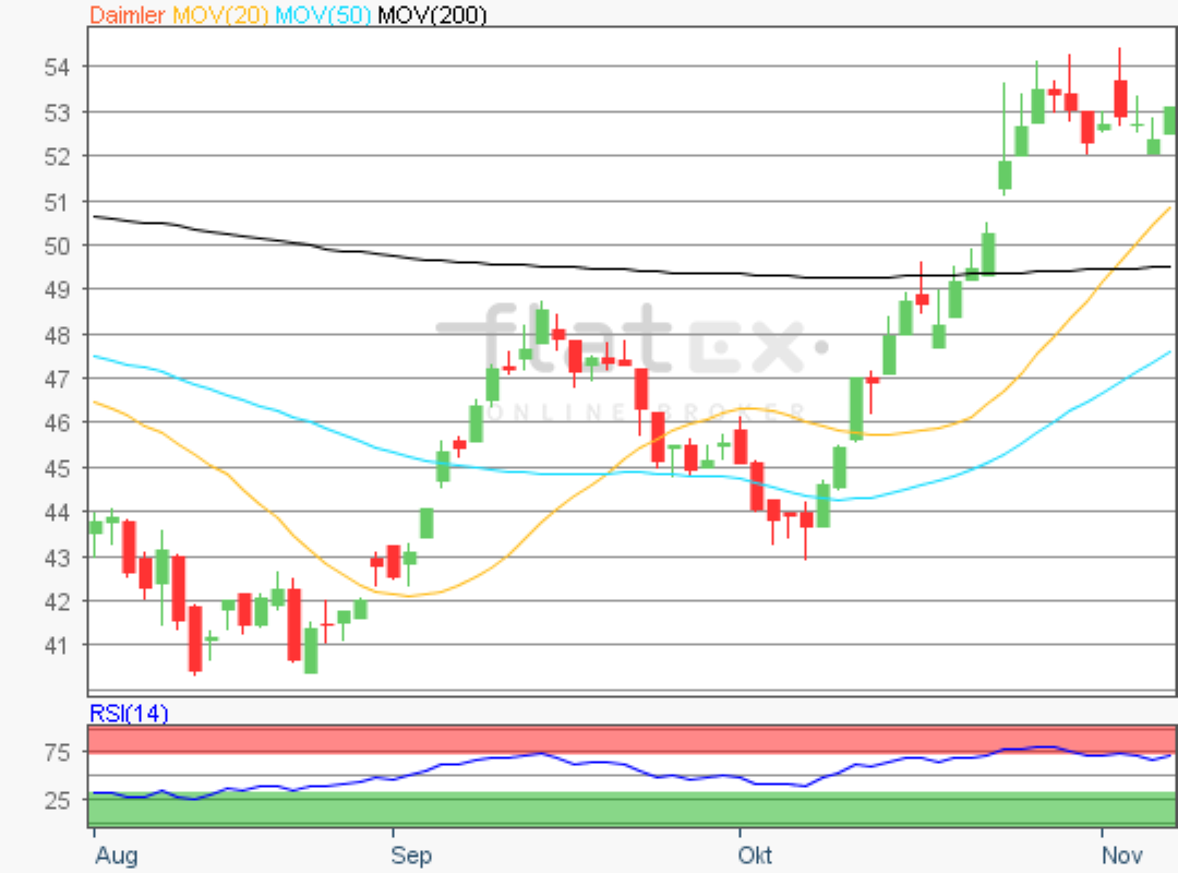 Die Aktie des DAX-Konzerns Daimler notierte am 04. November 2019 auf einem letzten Zwischenhoch von 54,50 Euro.