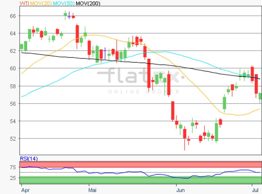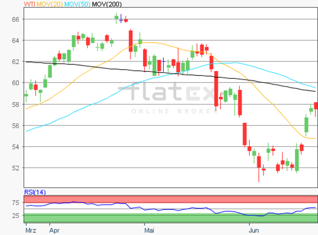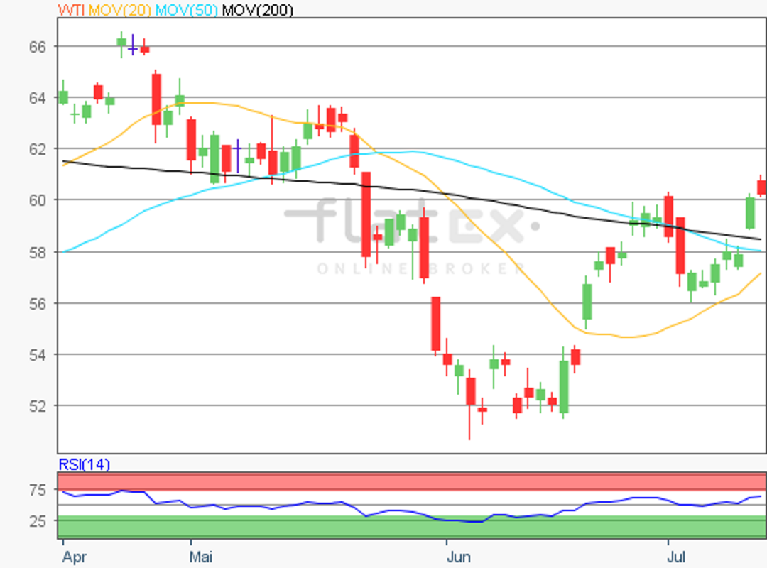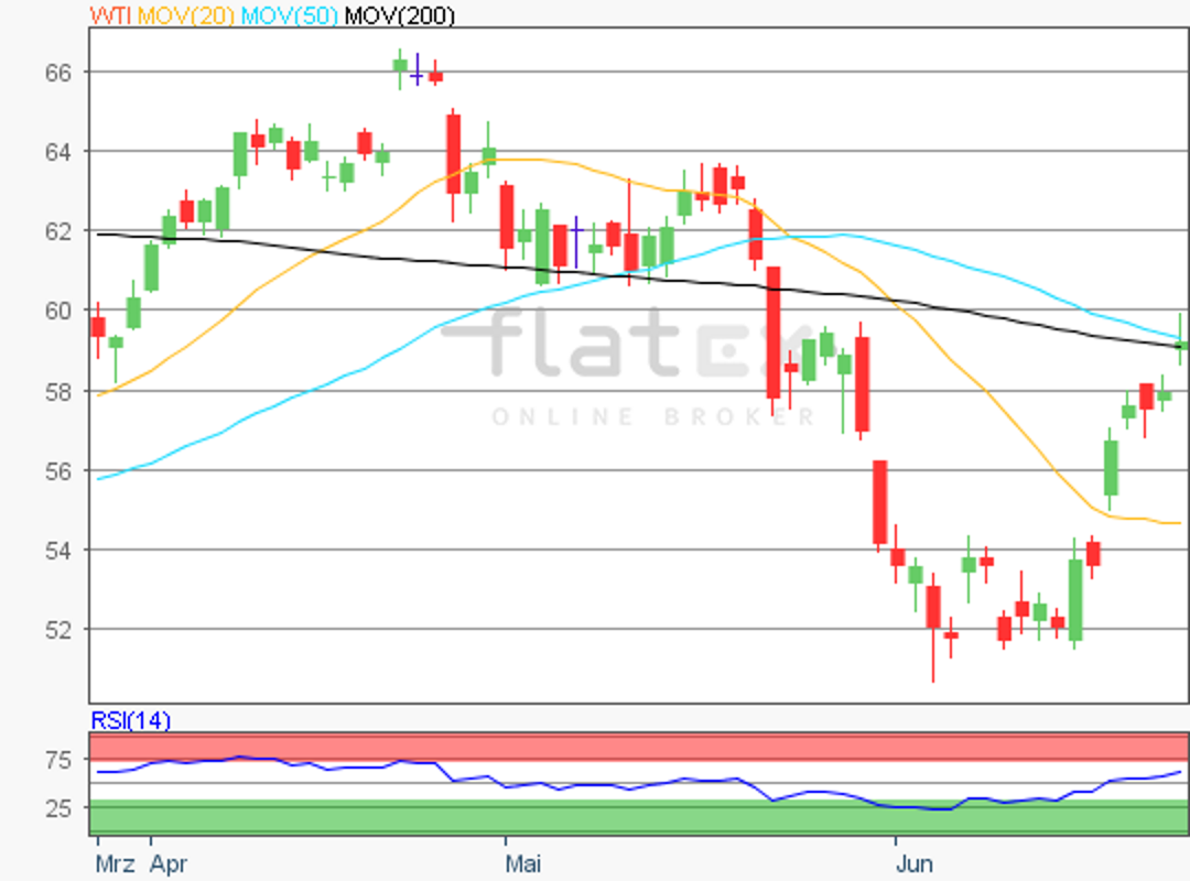 Die leichten Preisrücksetzer vom Wochenbeginn muten eher als technisch bedingte Konsolidierungen an, denn auf 4-Stunden- und 1-Stunden-Chartbasis notierte der WTI-August-Kontrakt schließlich massiv im überkauften Bereich mit RSI-Werten jenseits der 80 Punkte.