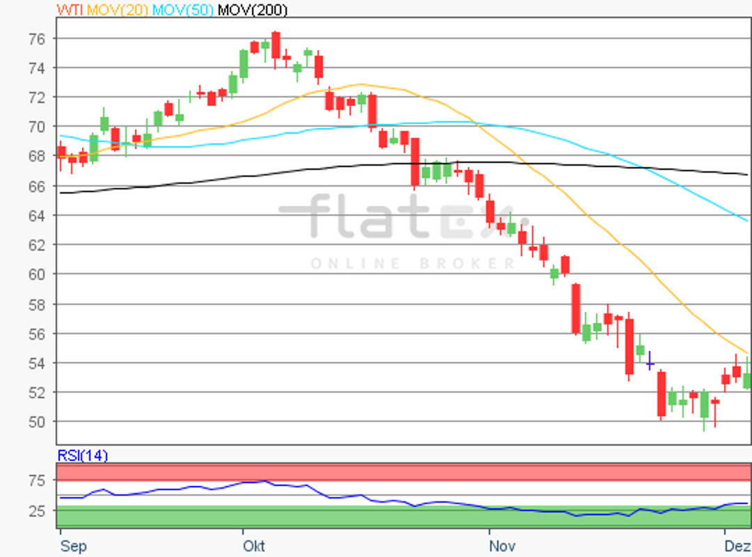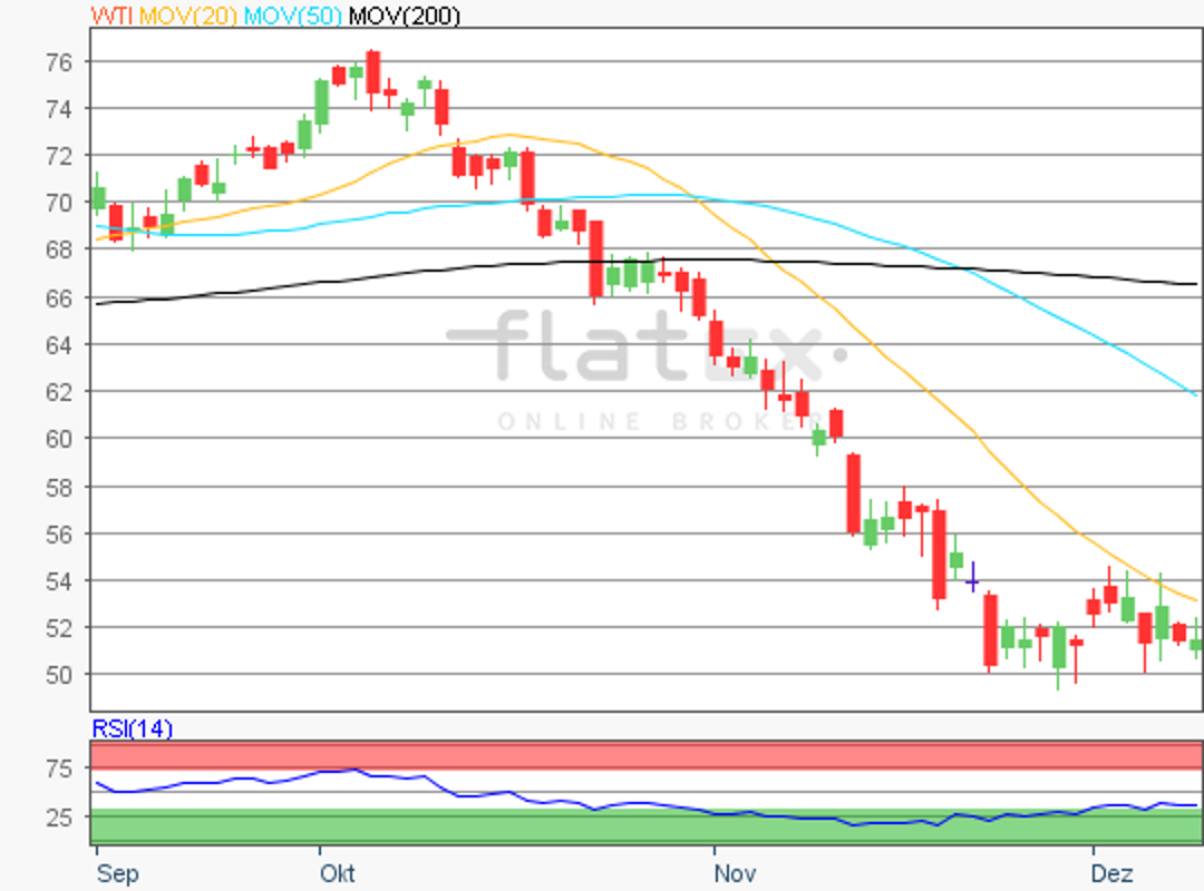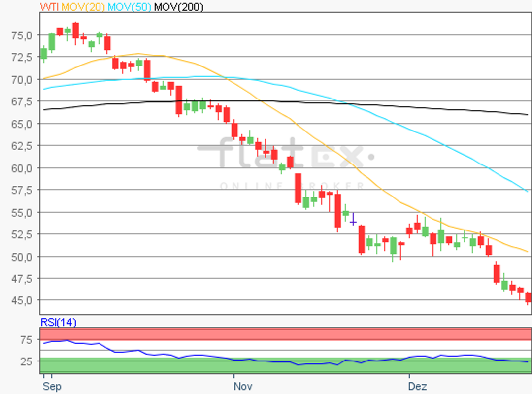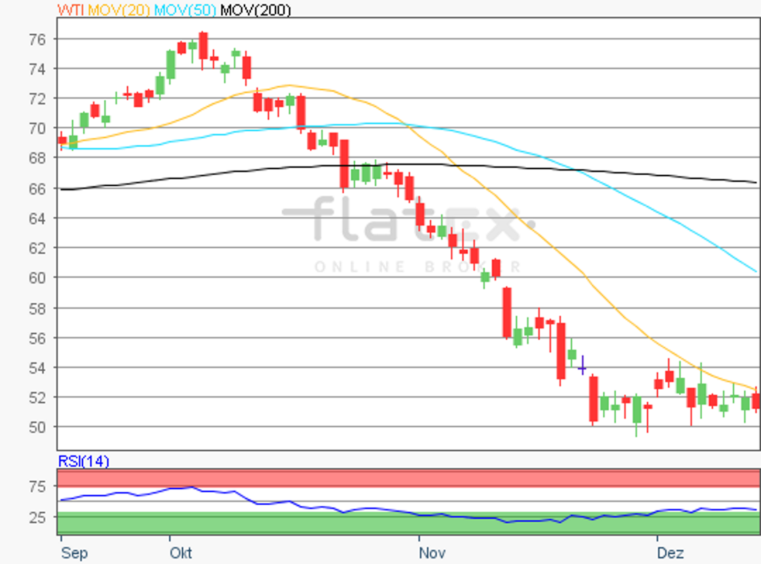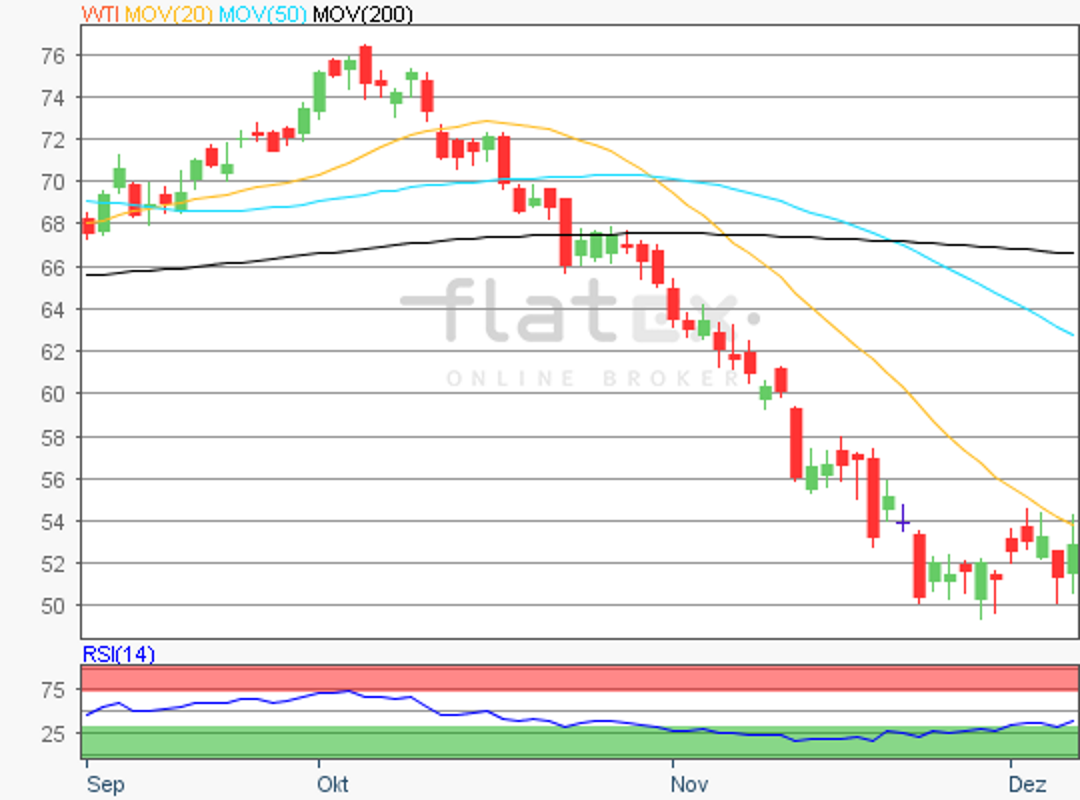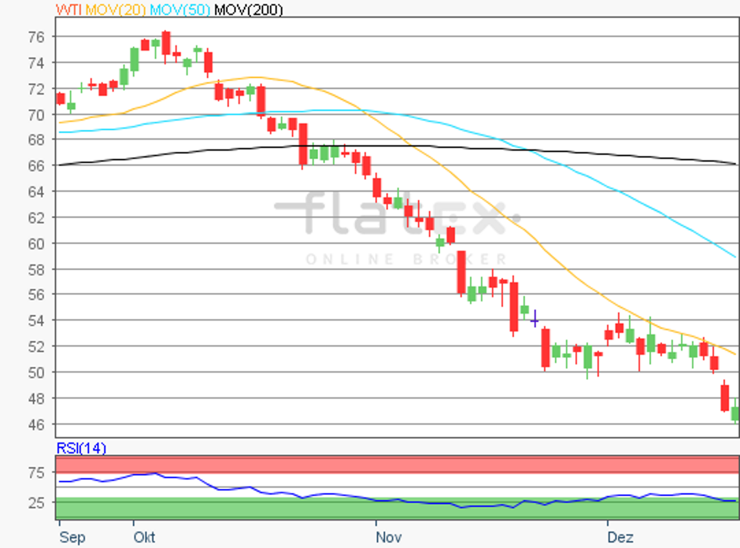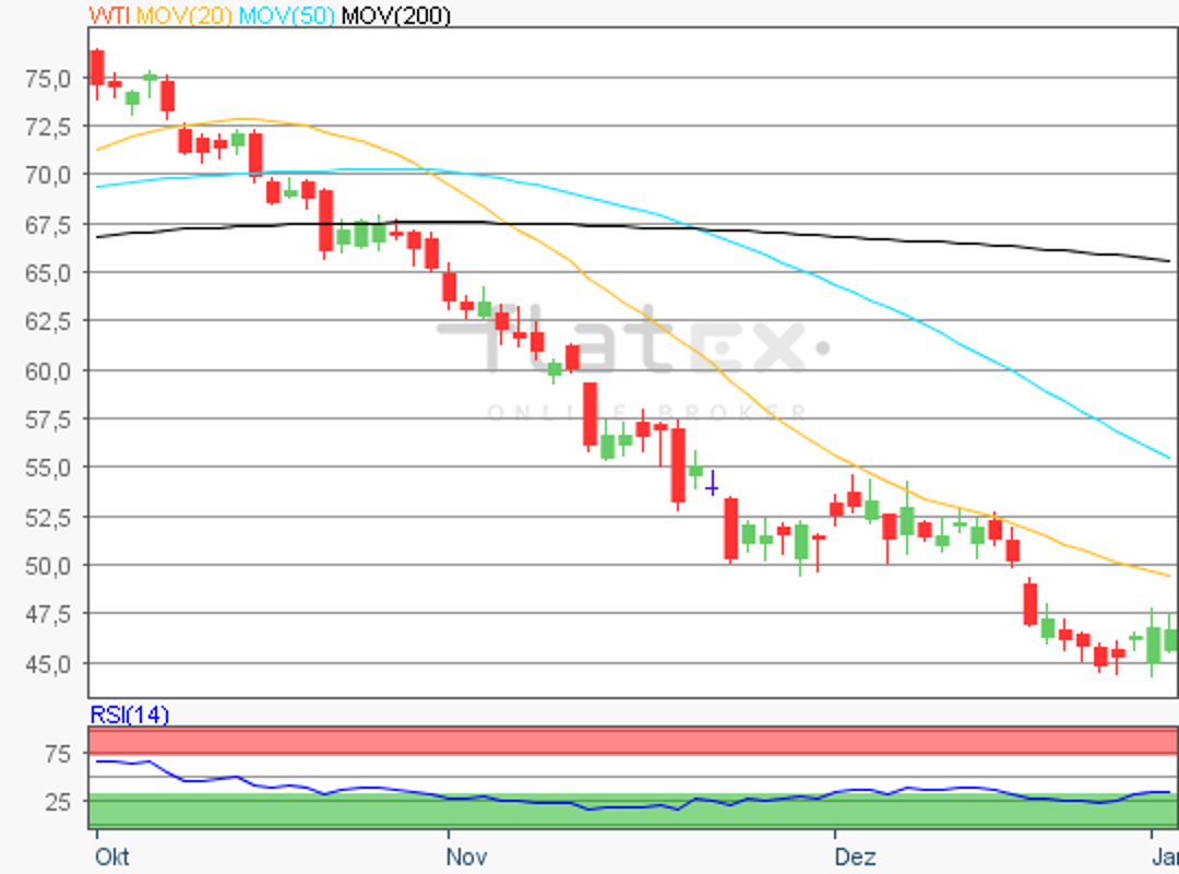 Der Preis für ein Fass Rohöl der Sorte WTI (West Texas Intermediate) im Februar-Kontrakt an der NYMEX fiel innerhalb weniger Monate vom Hoch des 03. Oktober 2018 bei 76,40 US-Dollar bis zum Tief des 24. Dezember 2018 bei 42,36 US-Dollar um rund 34 US-Dollar je Fass.