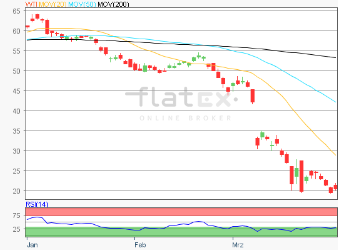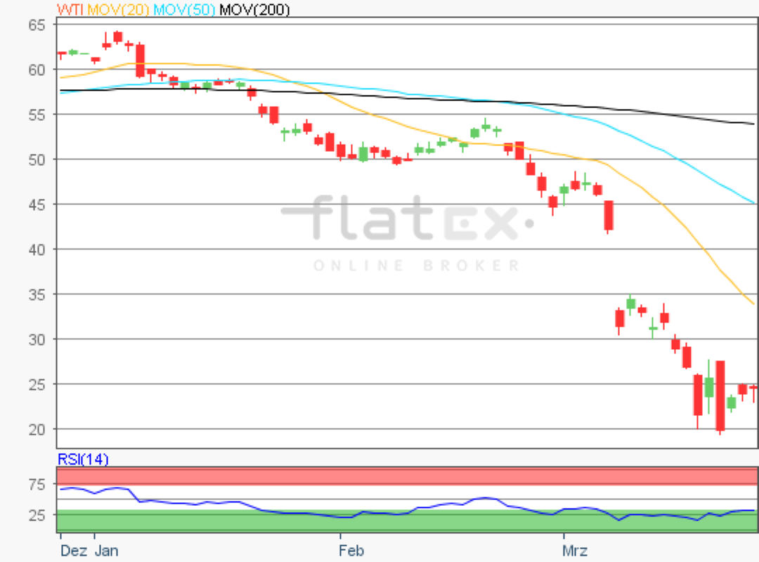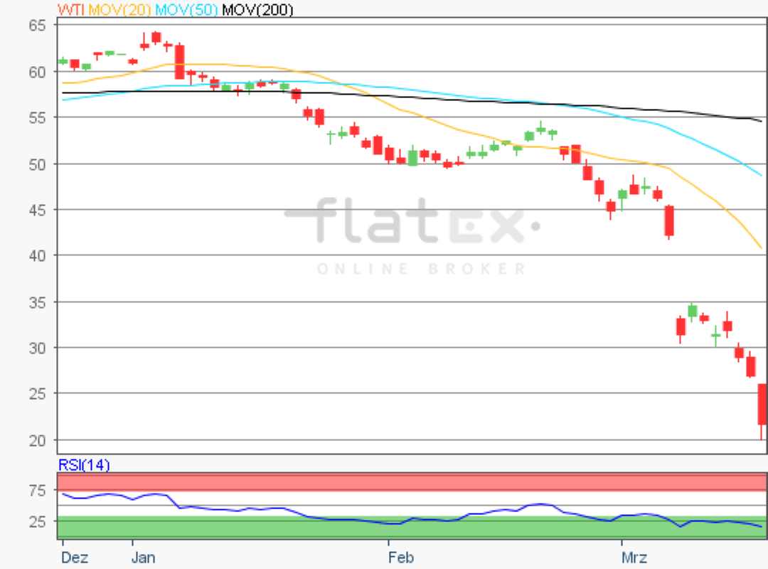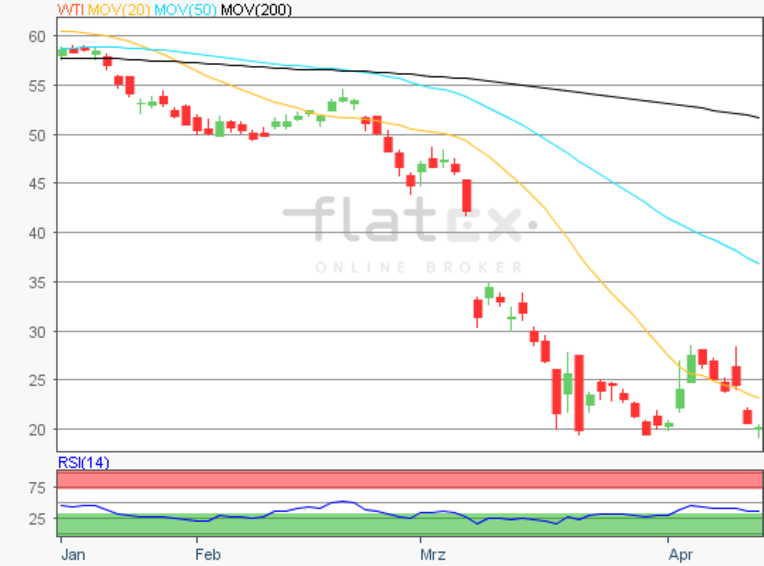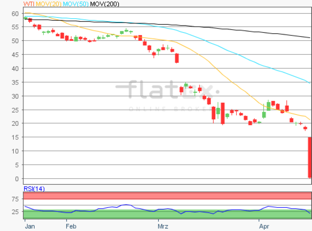 Der Preis für ein Fass Rohöl der US-Sorte WTI (West Texas Intermediate) im Mai-Kontrakt an der US-Terminbörse NYMEX „crashte“ am Mittwoch einmal mehr. Diesmal fiel der Preis in der Spitze um rund 23 Prozent.