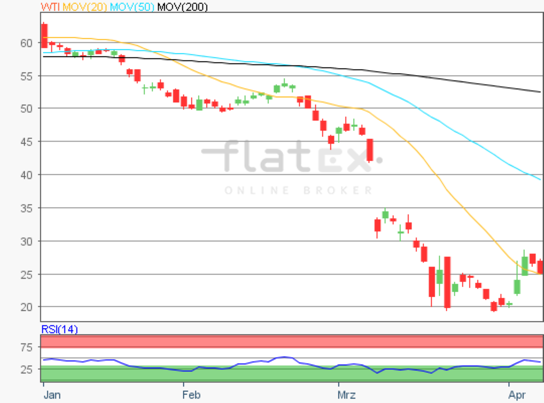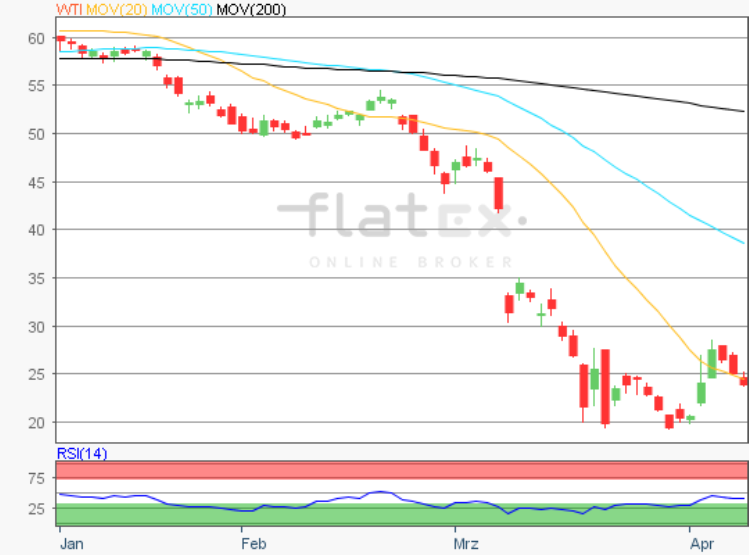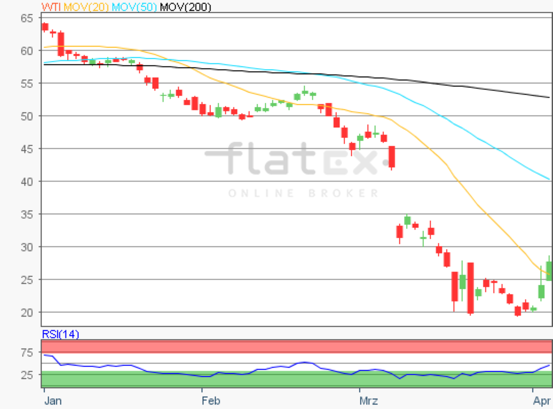 Der Preis für ein Fass Rohöl der US-Sorte WTI im Mai-Kontrakt an der US-Terminbörse NYMEX kam in den letzten Handelstagen trotz der Ankündigung von Produktionskürzungen von 9,7 Millionen Fass pro Tag durch die OPEC+.