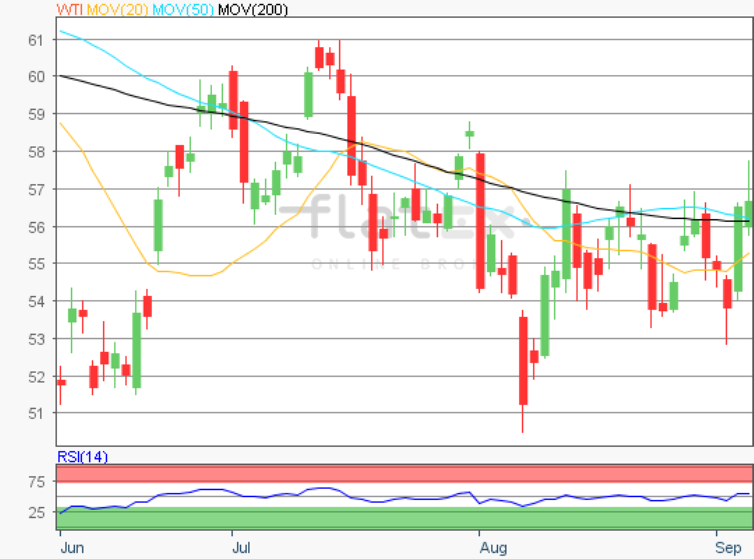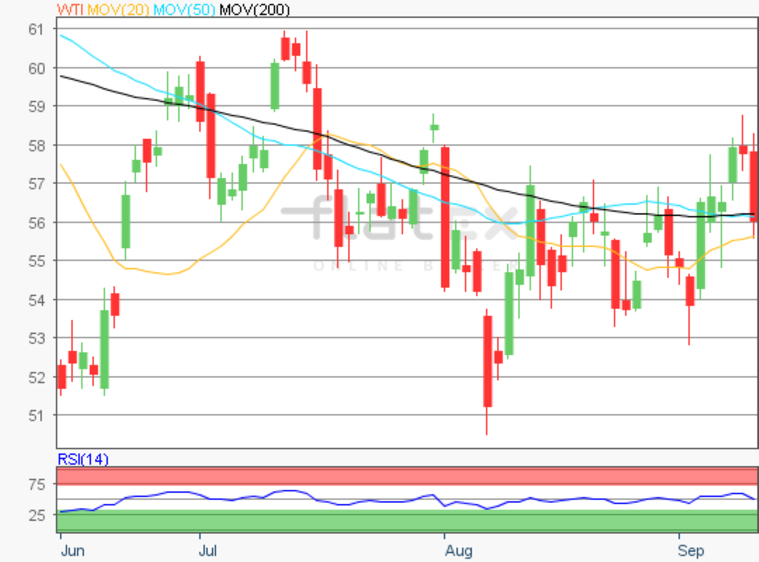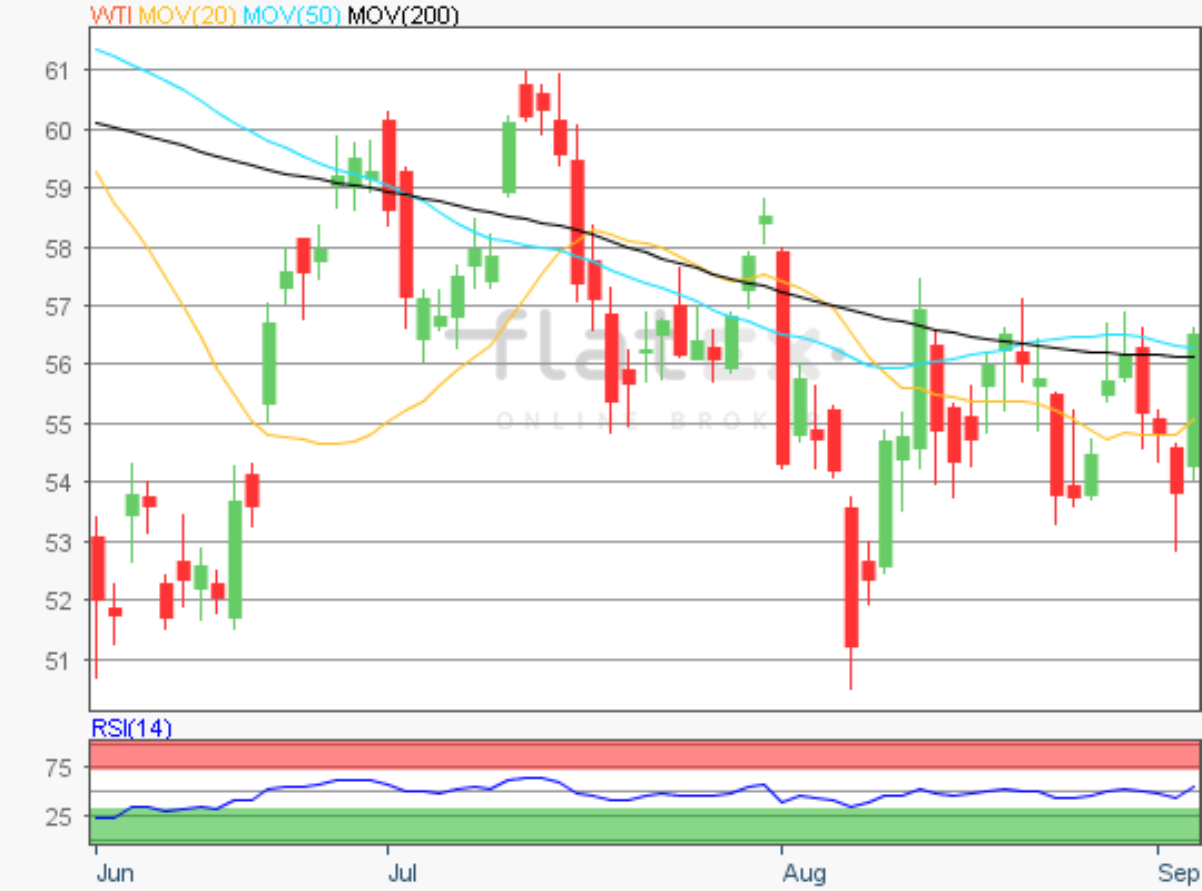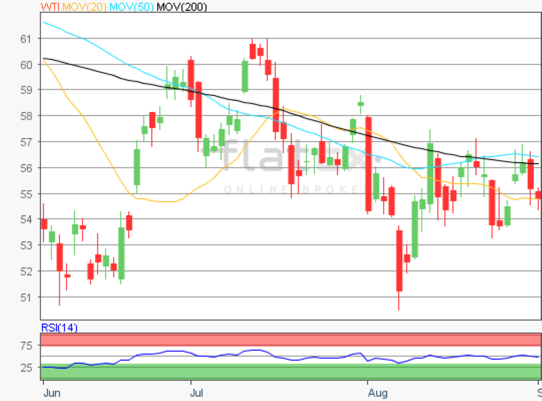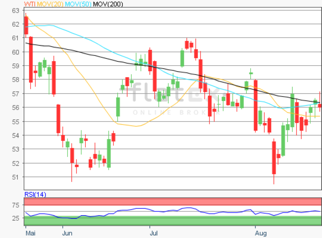 Der Preis für ein Fass Rohöl der US-Sorte WTI im Oktober-Kontrakt an der US-Terminbörse NYMEX wird wie der Aktienmarkt durch die ständigen Twitter-Tiraden des US-Präsidenten und dem täglichen Nachrichtenfluss zum Handelskonflikt auf eine Achterbahnfahrt geschickt.