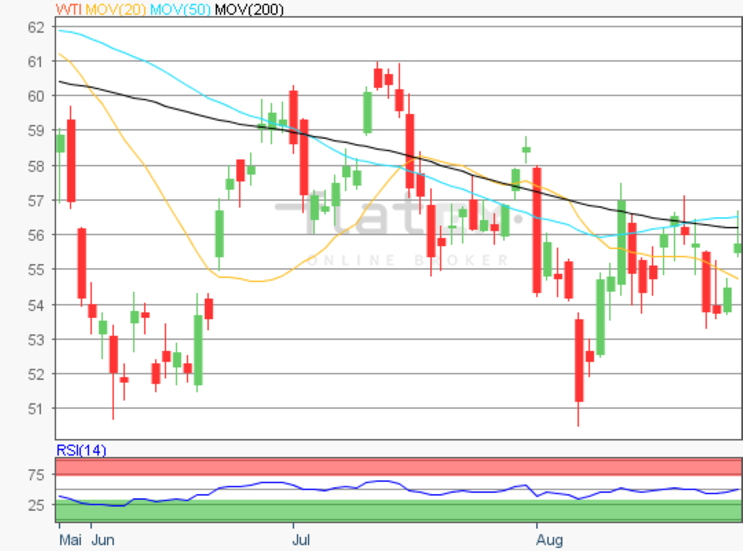Der Preis für ein Fass Rohöl der US-Sorte WTI (West Texas Intermediate) im Oktober-Kontrakt an der US-Terminbörse NYMEX korrigierte zuletzt bis an ein 61,8prozentiges Fibonacci-Retracement bei der Marke von 52,83 US-Dollar.
