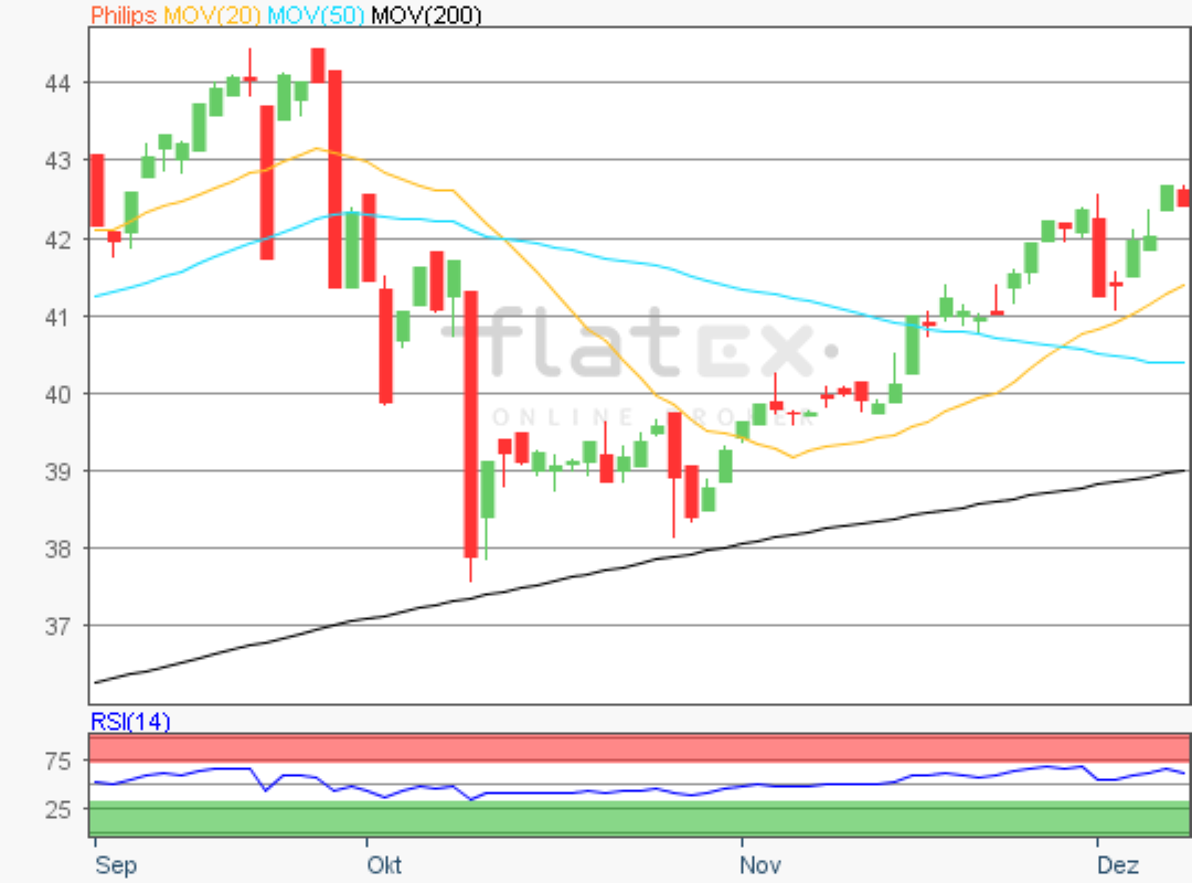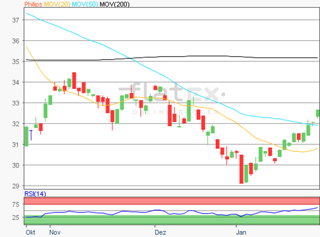 Die Aktie des niederländischen Elektrotechnologiekonzerns Philips notierte am 04. Januar 2019 mit 29,04 Euro auf einem Verlaufstief.