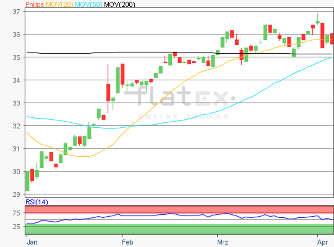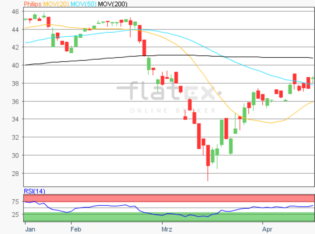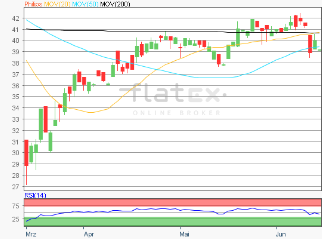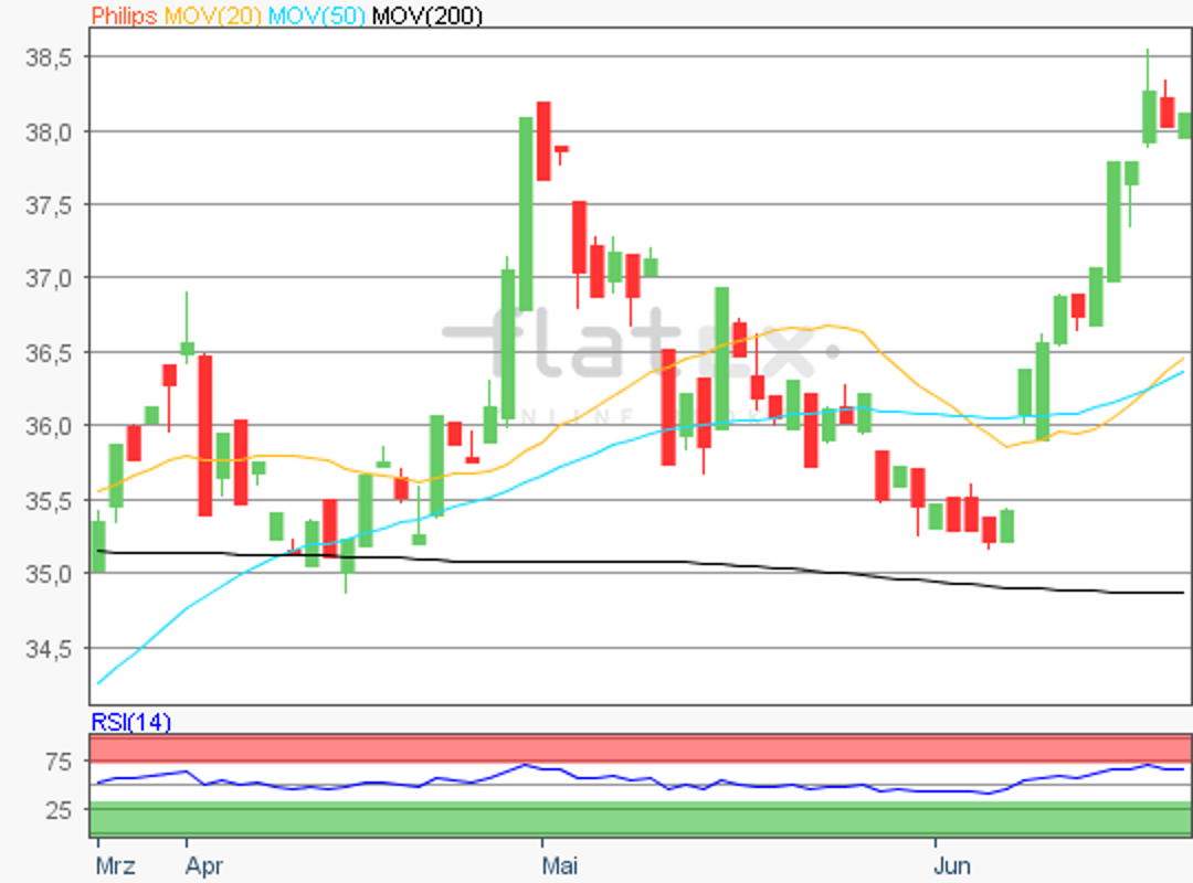 Die Aktie des EuroStoxx50-Konzerns Philips bildete am 03. Mai 2019 ein letztes Hoch von 37,98 Euro aus.