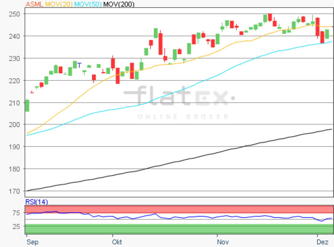 Die Aktie des EuroStoxx50-Konzerns ASML notierte am 29. November 2019 auf einem letzten Hoch von 249,65 Euro.